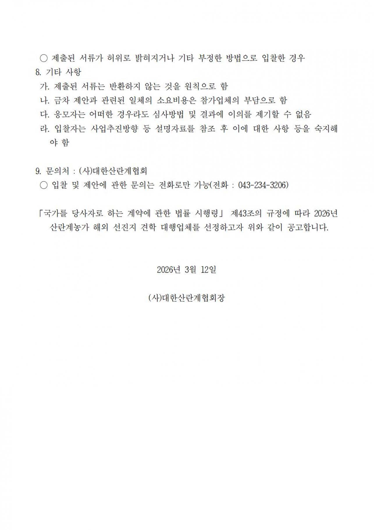 | (첨부1)2026년 산란계농가 해외선진지 견학 업체선정 공고문.hwpx (첨부2) 2026년 산란계농가의 해외선진지 견학 제안요청서.hwp | |||