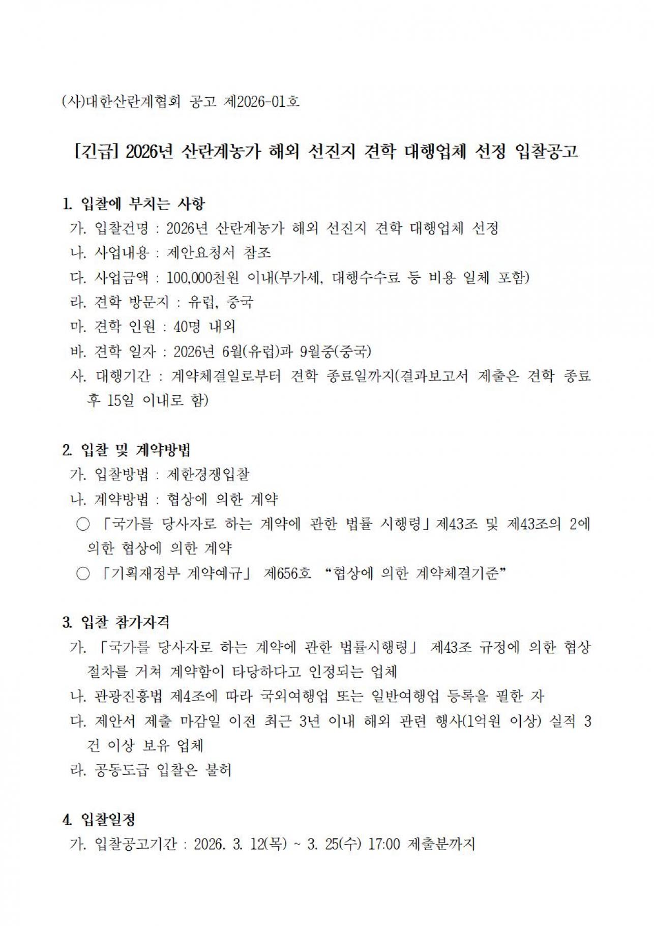 [긴급] 2026년 산란계농가 해외 선진지 견학 대행업체 선정 입찰공고 |
