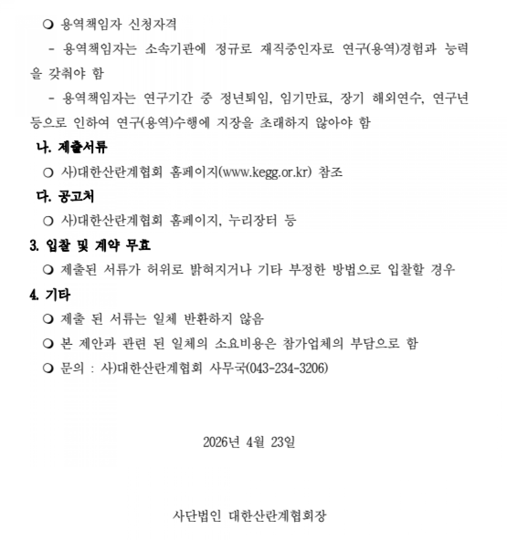 | (별첨1) 현재 유행하는 산란계질병 현황 및 대책연구 입찰제안서.hwp (별첨2) 2026년 대한산란계협회 조사연구_원가계산 및 정산기준.hwp 현재 유행하는 산란계질병 현황 및 대책연구 공고문.pdf | |||