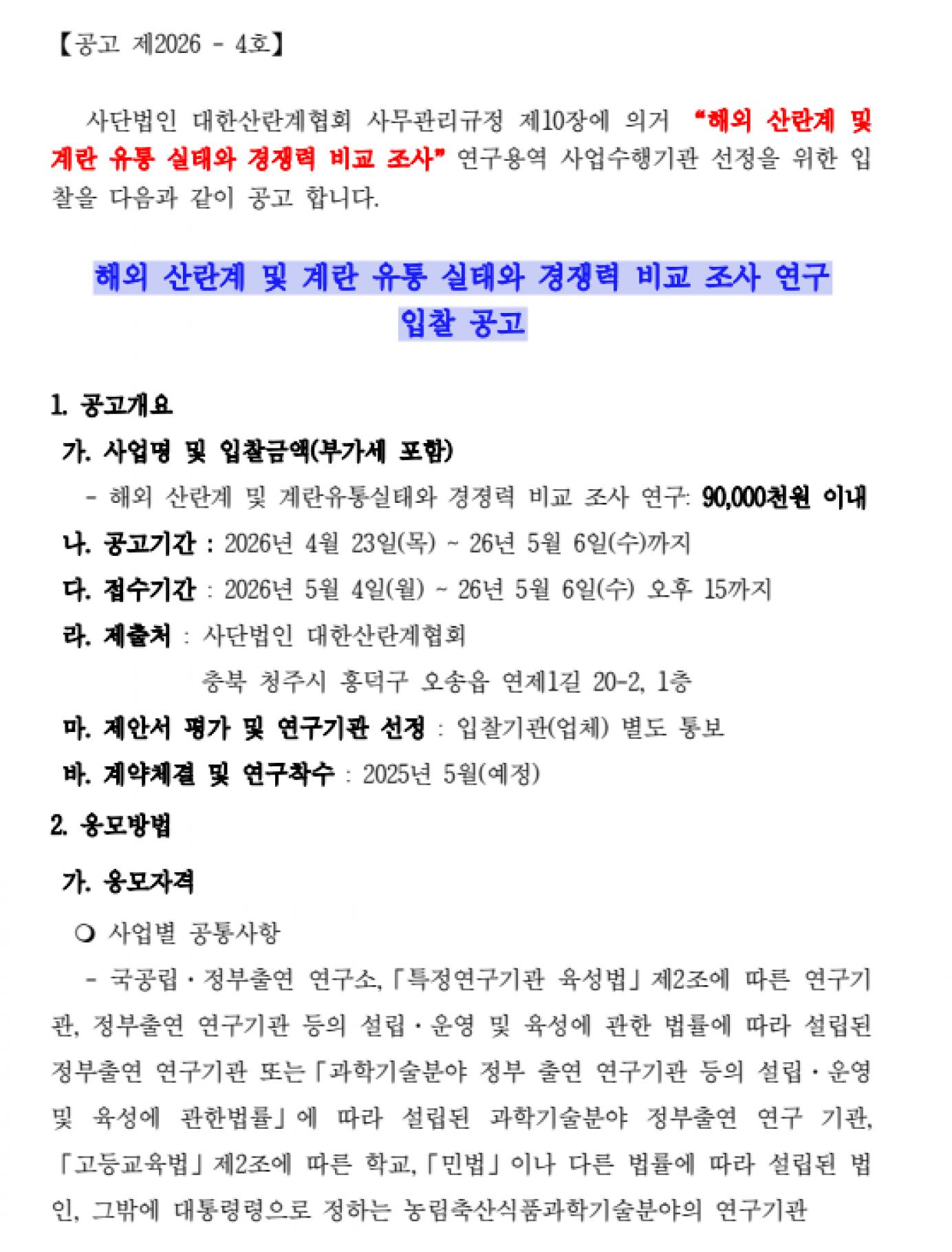 | (별첨1) 해외 산란계 및 계란 유통 실태와 경쟁력 비교 조사 연구 입찰제안서.hwp (별첨2) 2026년 대한산란계협회 조사연구_원가계산 및 정산기준.hwp 해외 산란계 및 계란 유통 실태와 경쟁력 비교 조사 연구 공고문.pdf | |||