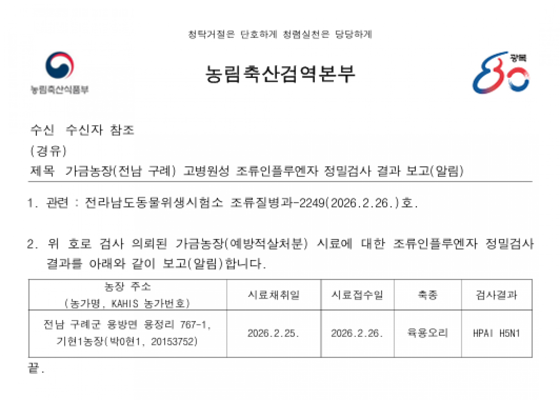 전남 구례 예방적 살처분 가금농장(육용오리) 고병원성 조류인플루엔자(AI) 확진에 따른 방역조치 알림