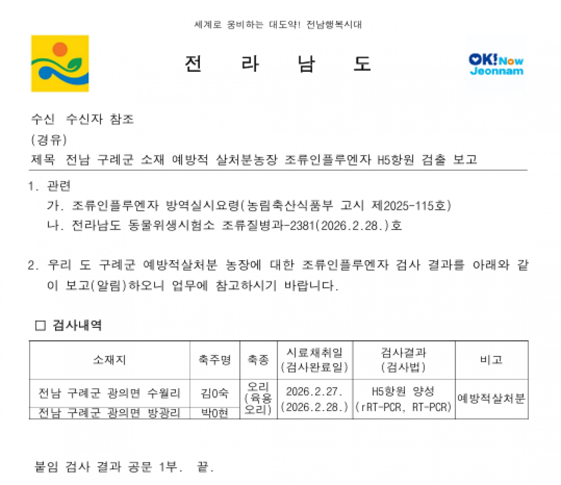 전남 구례 예방적 살처분 가금농장(육용오리) 고병원성 AI 의사환축 발생에 따른 방역강화 조치