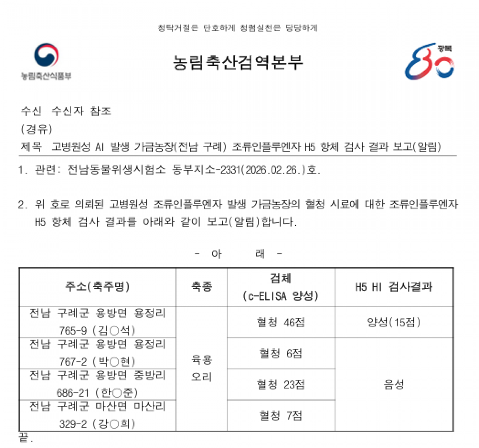 전남 구례군 가금농장(육용오리) H5형 AI 항체 검출에 따른 방역조치 알림
