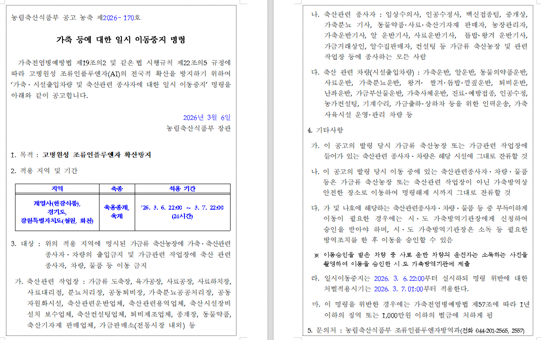 가축(육용종계,육계) 등에 대한 일시 이동중지(Standstill) 명령 발령 알림