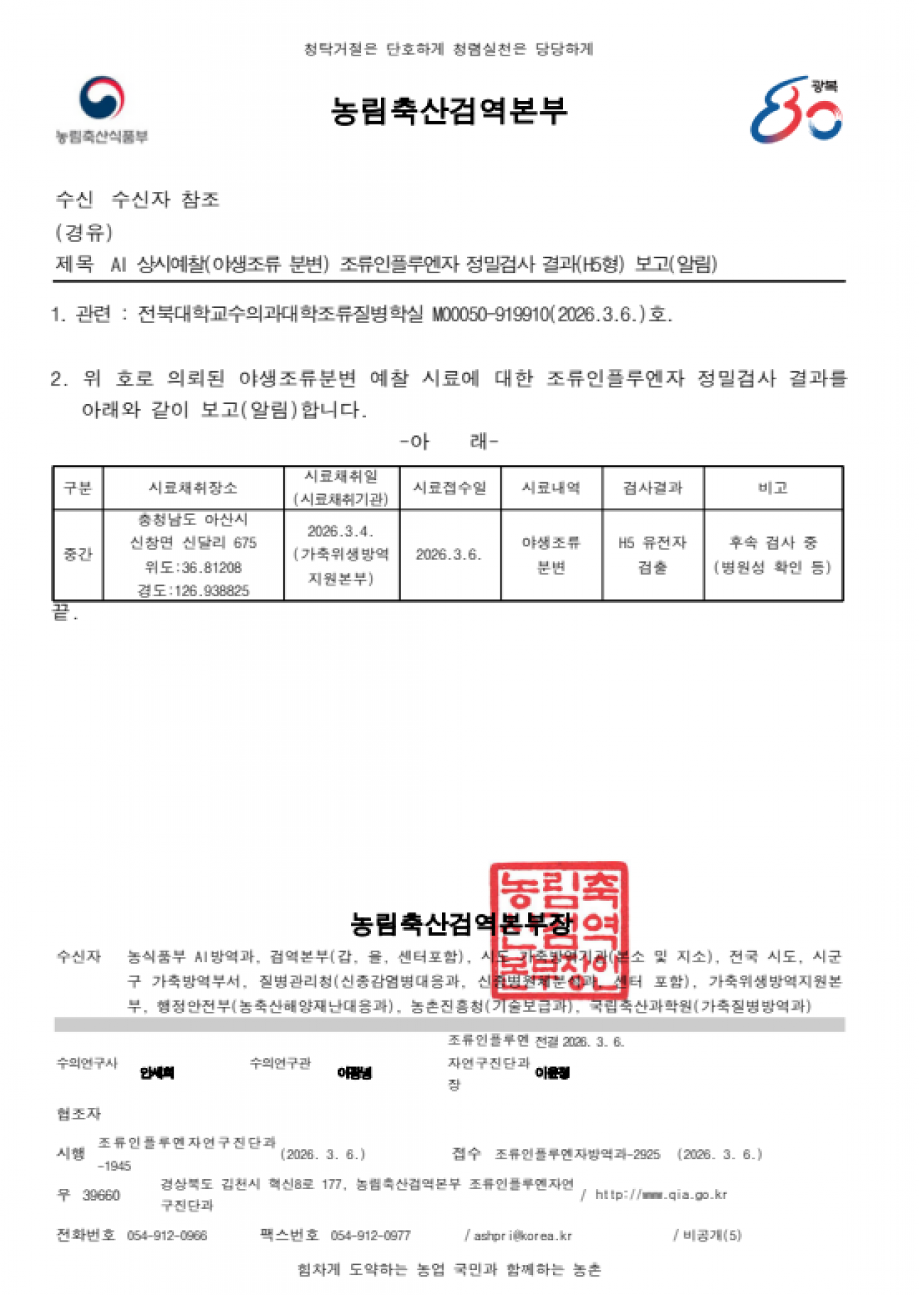 야생조류 조류인플루엔자(H5) 항원 검출에 따른 차단방역 및 예찰 강화 알림