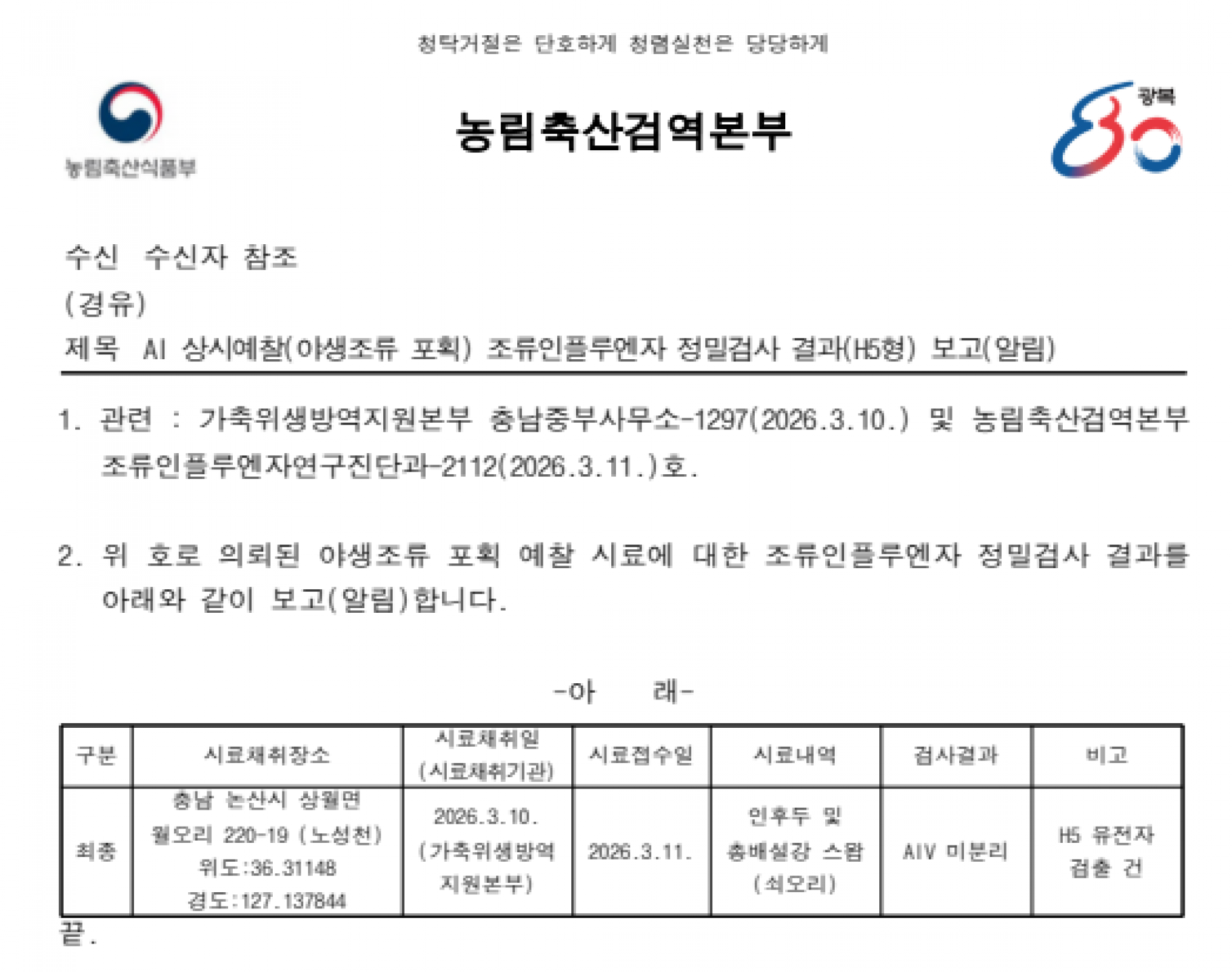충남 논산시 소재 야생조류 AI 항원 미분리 지점 관리에 대한 후속조치 알림