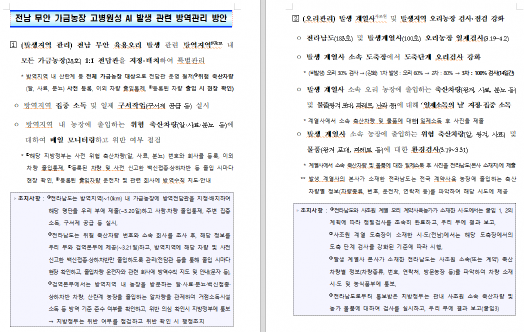고병원성 조류인플루엔자 발생 관련 중앙사고수습본부 회의(3.19) 후속 조치 알림
