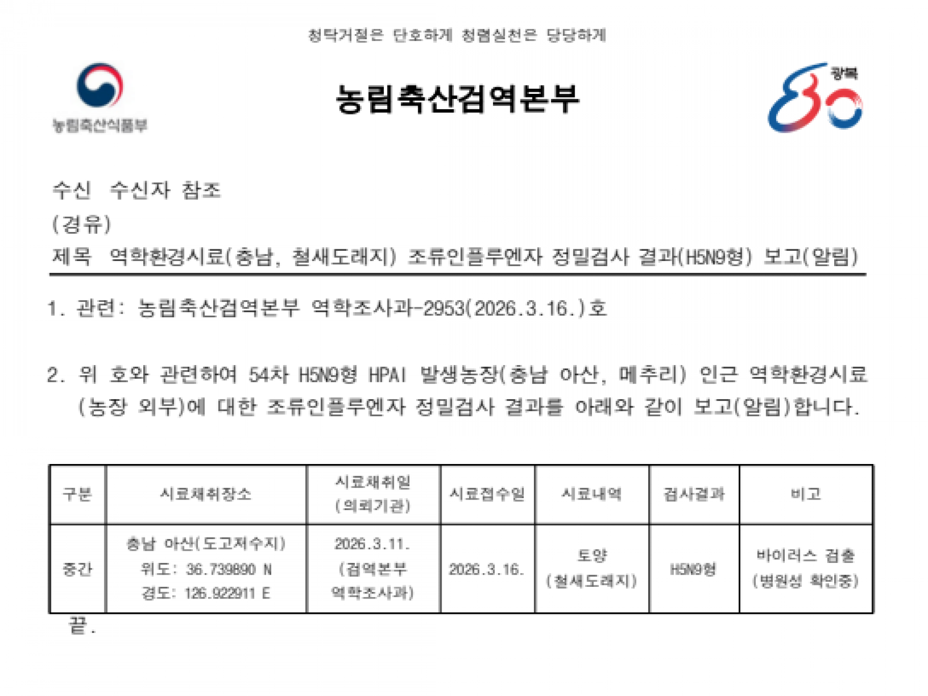 역학 환경시료(농장 인근 철새도래지) 조류인플루엔자(H5N9형) 검출에 따른 차단방역 및 예찰 강화 알림