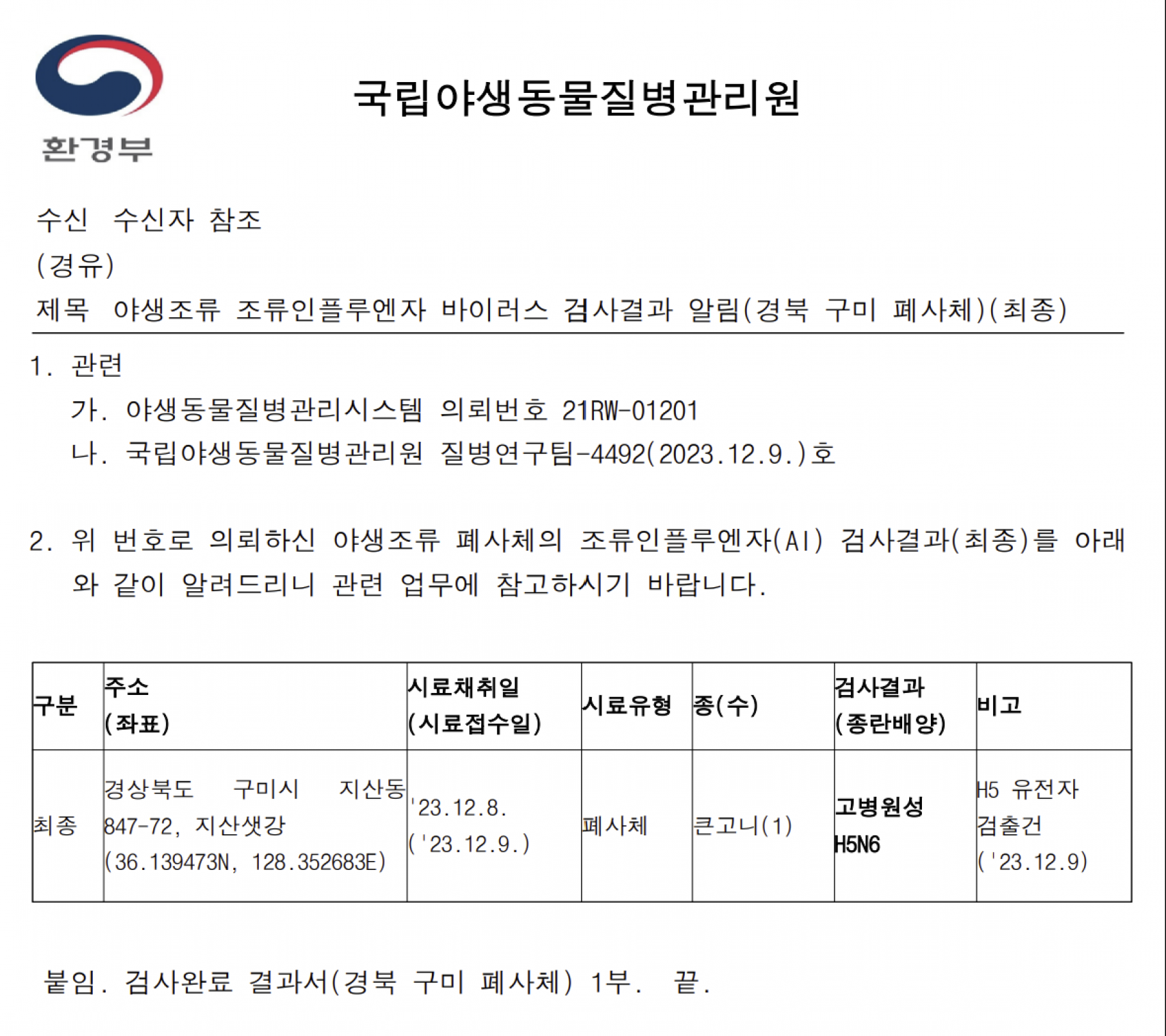 (경북 구미)야생조류 H5형 조류인플루엔자(AI) 항원 검출에 따른 차단방역 및 예찰 강화 알림