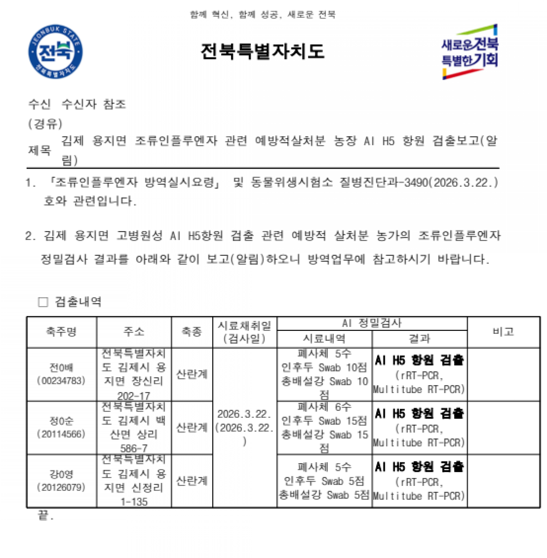전북 김제 예방적 살처분 가금농장(산란계) 고병원성 AI 의사환축 발생에 따른 방역강화 조치 |