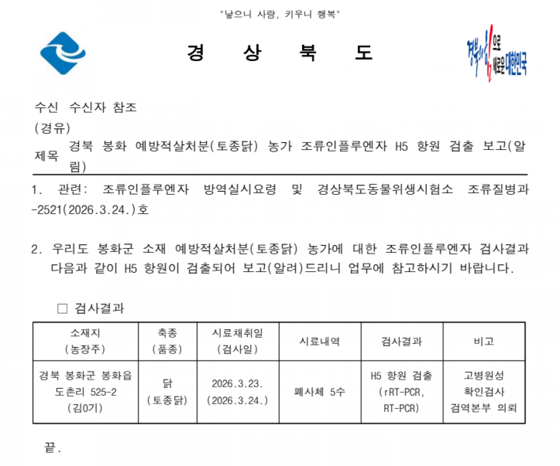 경북 봉화 예방적 살처분 가금농장(토종닭(청계)) 고병원성 AI 의사환축 발생에 따른 방역강화 조치