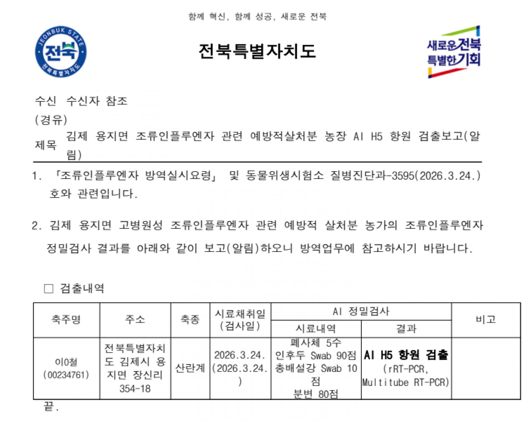 전북 김제 예방적 살처분 가금농장(산란계) 고병원성 AI 의사환축 발생에 따른 방역강화 조치