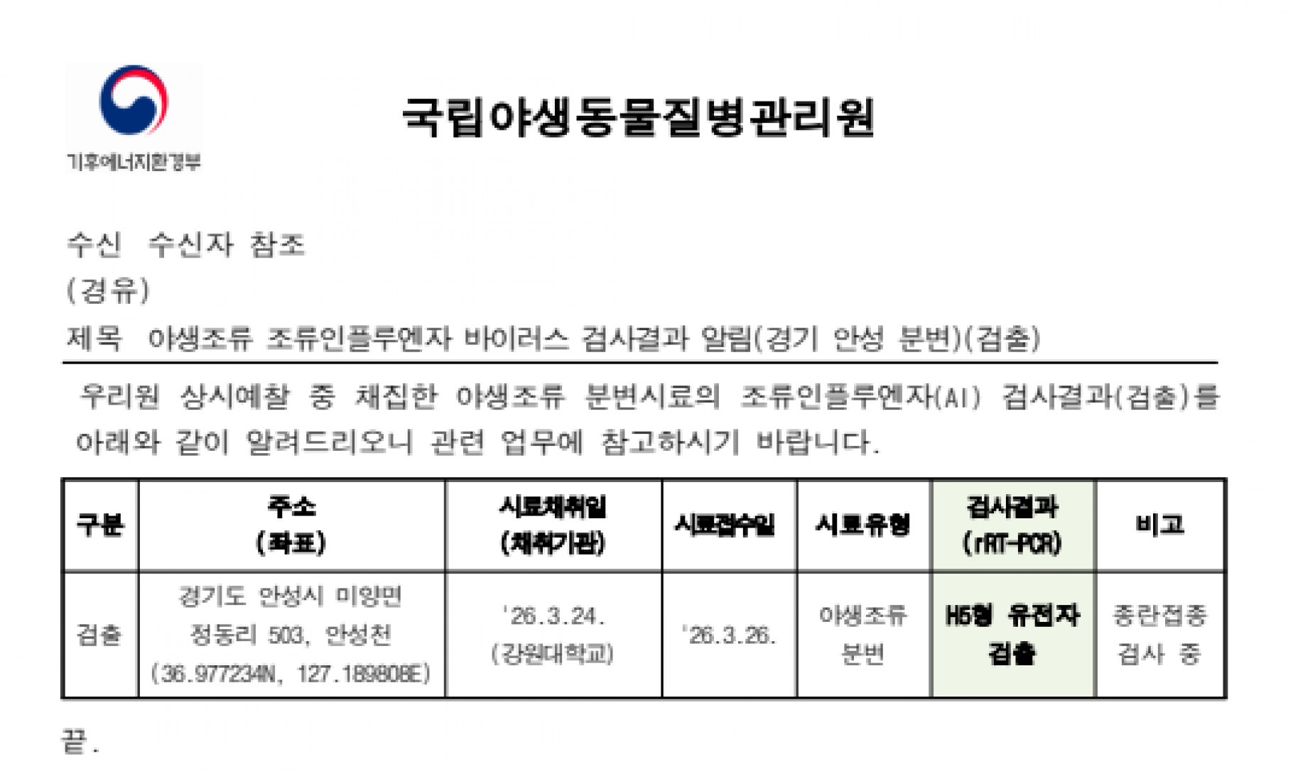야생조류 조류인플루엔자(H5) 항원 검출에 따른 차단방역 및 예찰 강화 알림