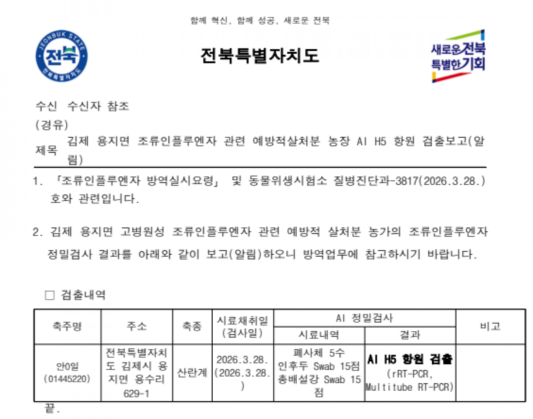 전북 김제 예방적 살처분 가금농장(산란계) 고병원성 AI 의사환축 발생에 따른 방역강화 조치