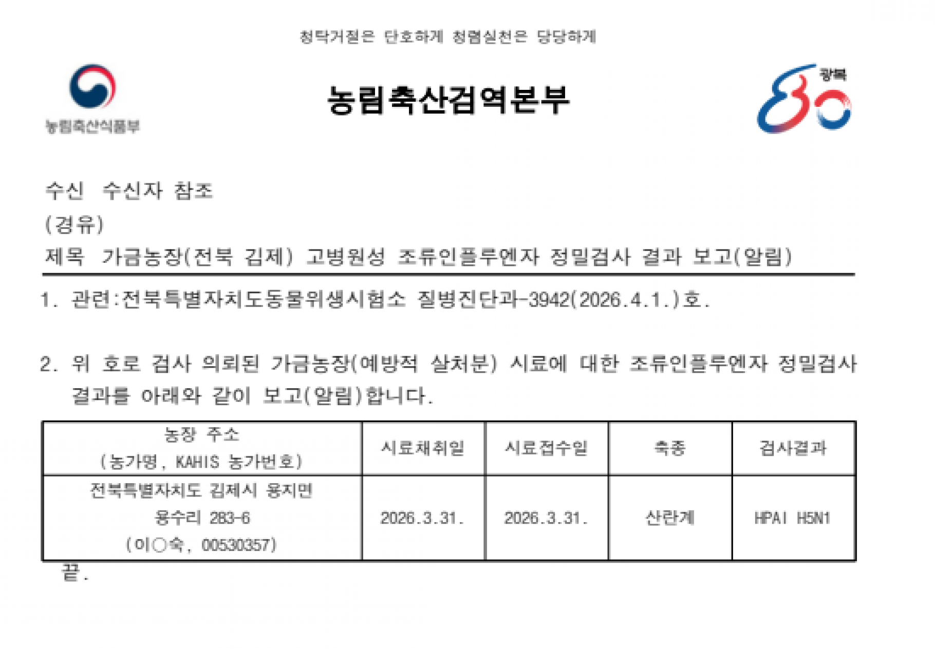 전북 김제 예방적 살처분 가금농장(산란계) 고병원성 조류인플루엔자(AI) 확진에 따른 방역조치 알림