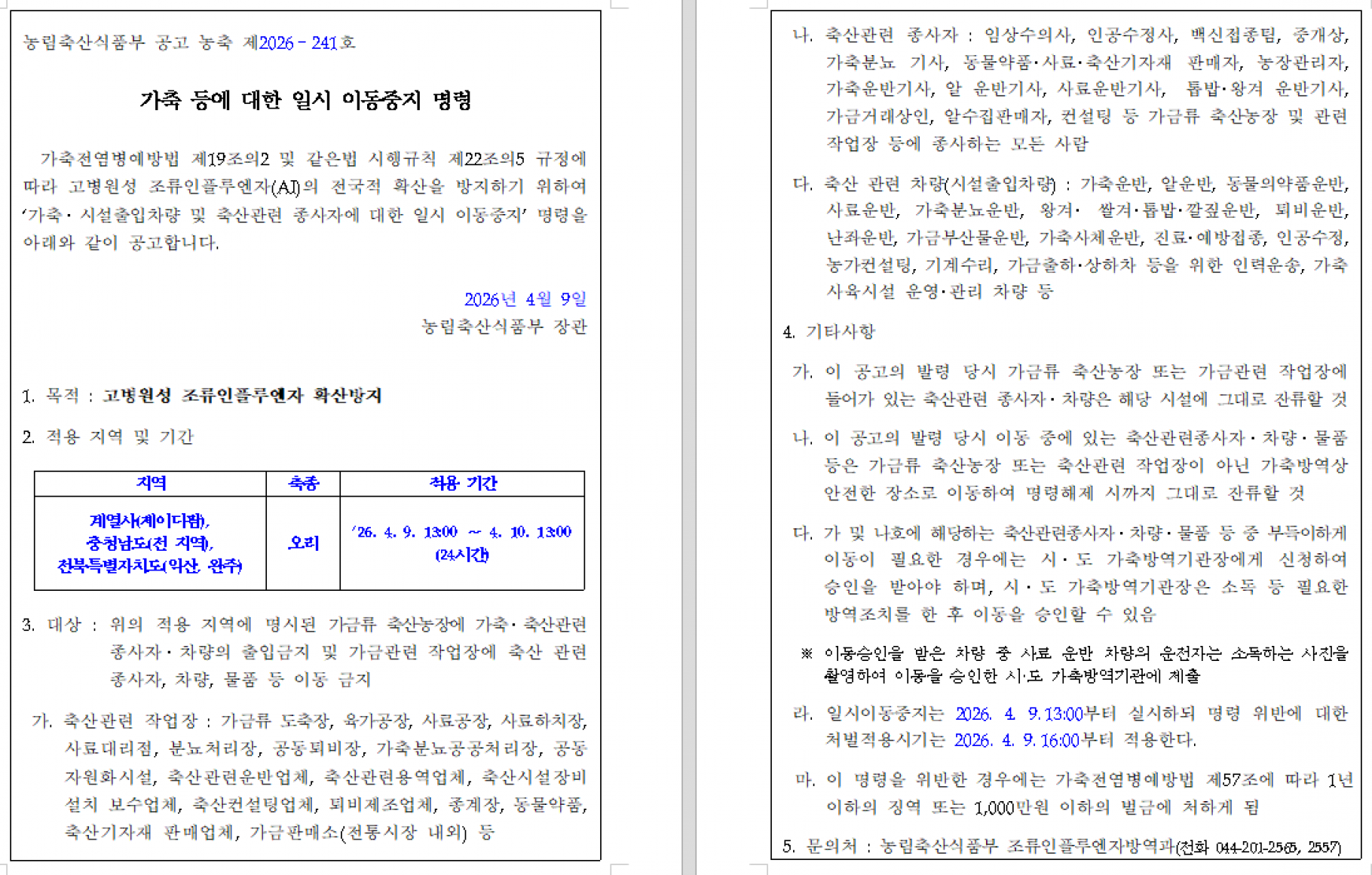 가축(오리) 등에 대한 일시 이동중지(Standstill) 명령 발령 알림