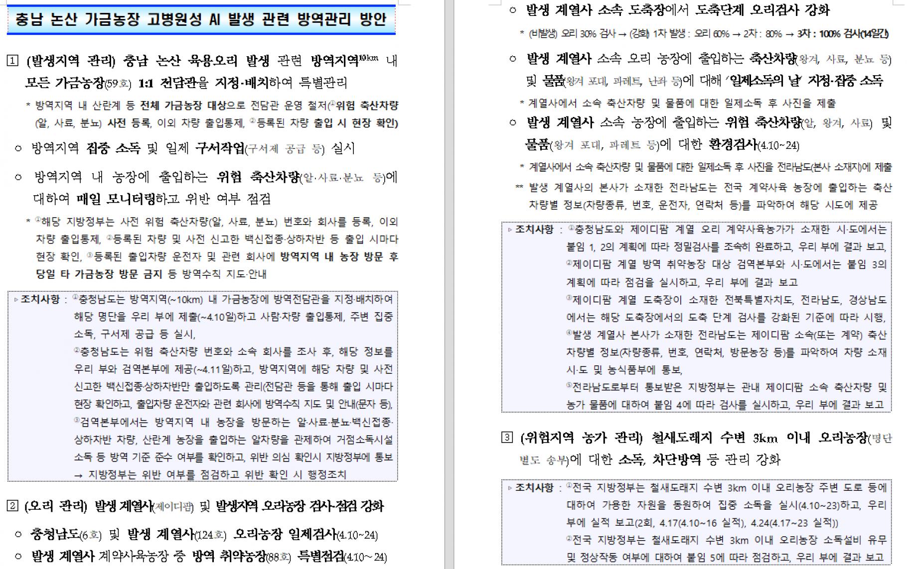 고병원성 조류인플루엔자 발생 관련 중앙사고수습본부 회의(4.9) 후속 조치 알림