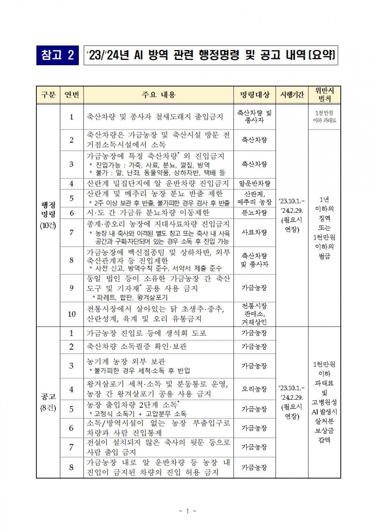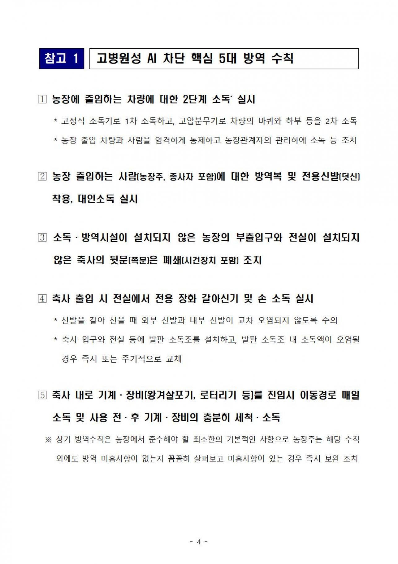 이번 겨울 고병원성 조류인플루엔자는 지난 12.3. 육용오리 농장에서 첫 발생 후 3개 시도(7개 시군)에서 15건이 발생하는 등 빠르게 확산되고 있습니다. 발생 농장에 대한 역학조사 결과 및 일시 이동중지 명령 이행결과 등 방역조치와 관련이 있는 경우 축산농장, 축산관계시설 및 차량에 대한 이동제한, 청소 세척 소독 건조, 검사, 일제소독 등 방역조치가 필요하며, 일부 도축장 및 사료공장이 폐쇄되는 사례도 발생한 바 있습니다. 이에, 가금 관련 축산관계자의 긴장감과 경각심을 최대한 유지하고 축산차량으로 인한 전파를 차단하기 위한 방역수칙을 강조하여 알려드리니 농가에서는 붙임파일을 확인하시어 준수하여주시기 바랍니다. ![]() ![]() ![]() ![]() ![]() ![]() ![]()
