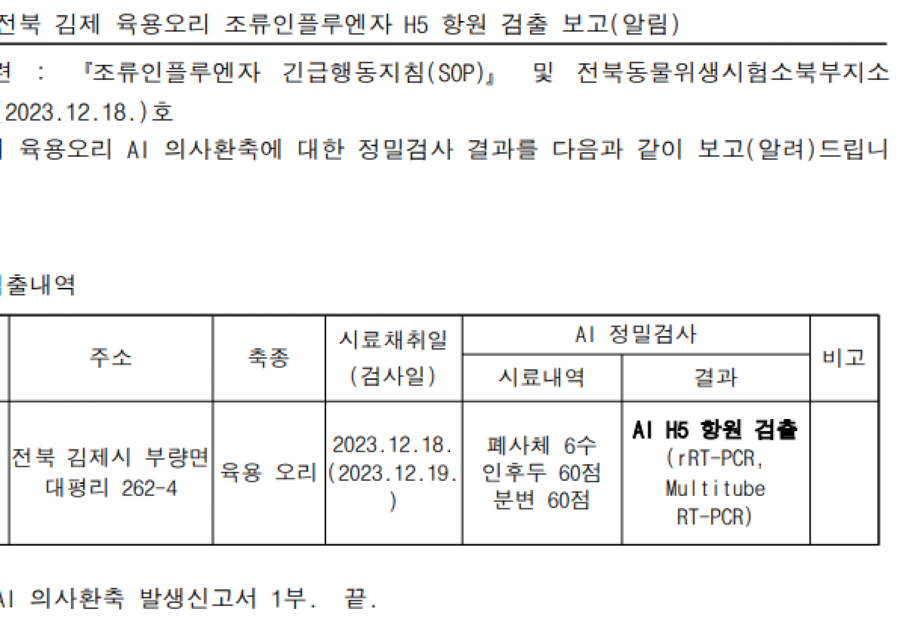 전북 김제 육용오리농장 고병원성 AI 의사환축 발생(21차)에 따른 방역강화 조치 |