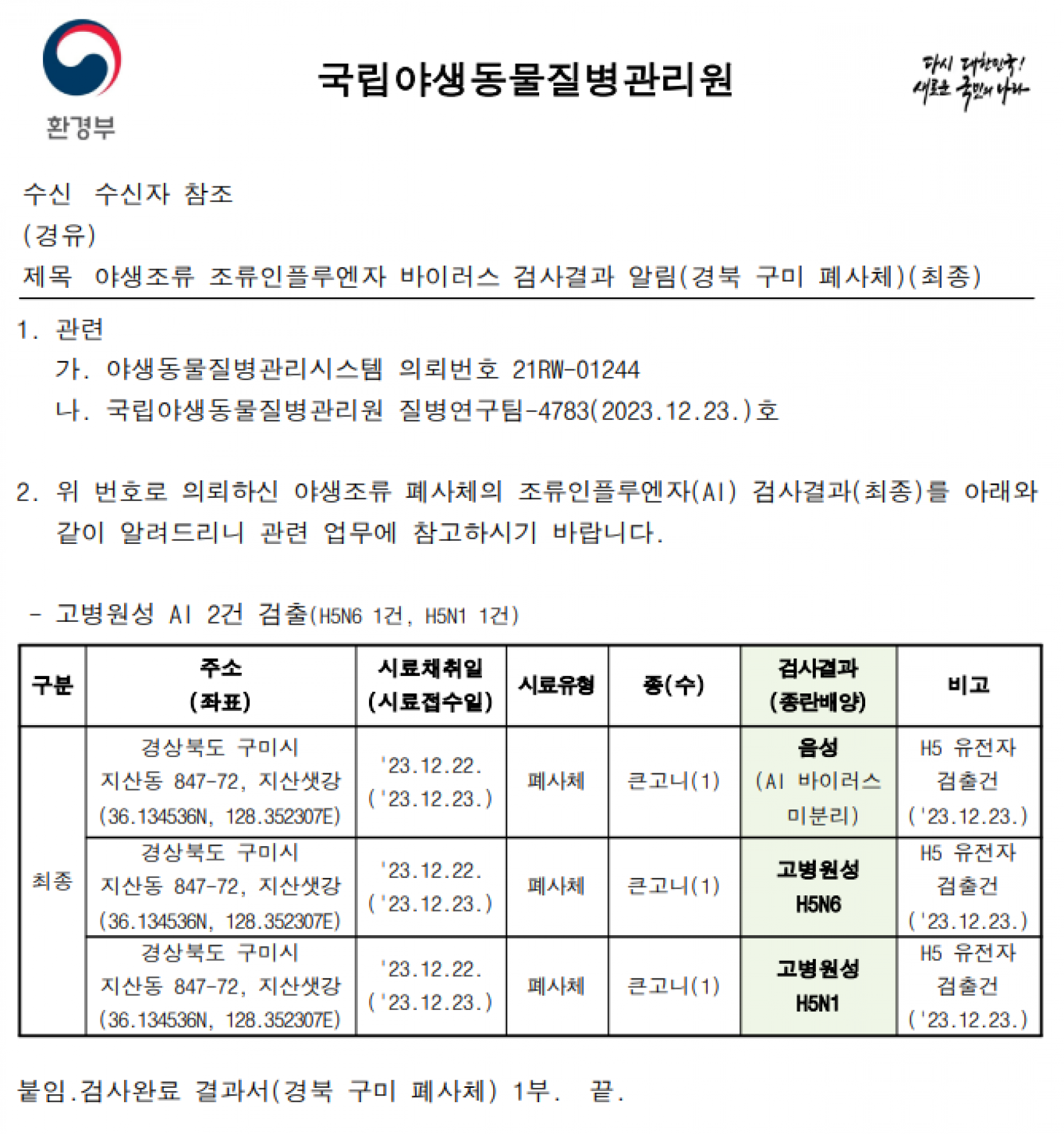 (경북 구미)야생조류 H5형 조류인플루엔자(H5N1, H5N6) 항원 검출에 따른 차단방역 및 예찰 강화 알림