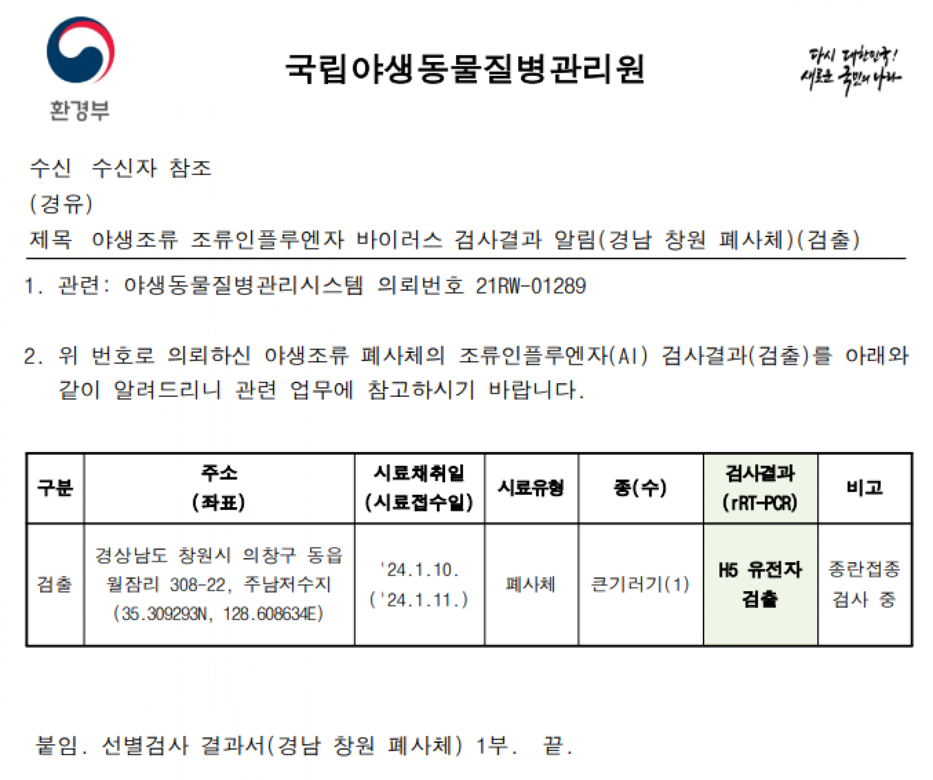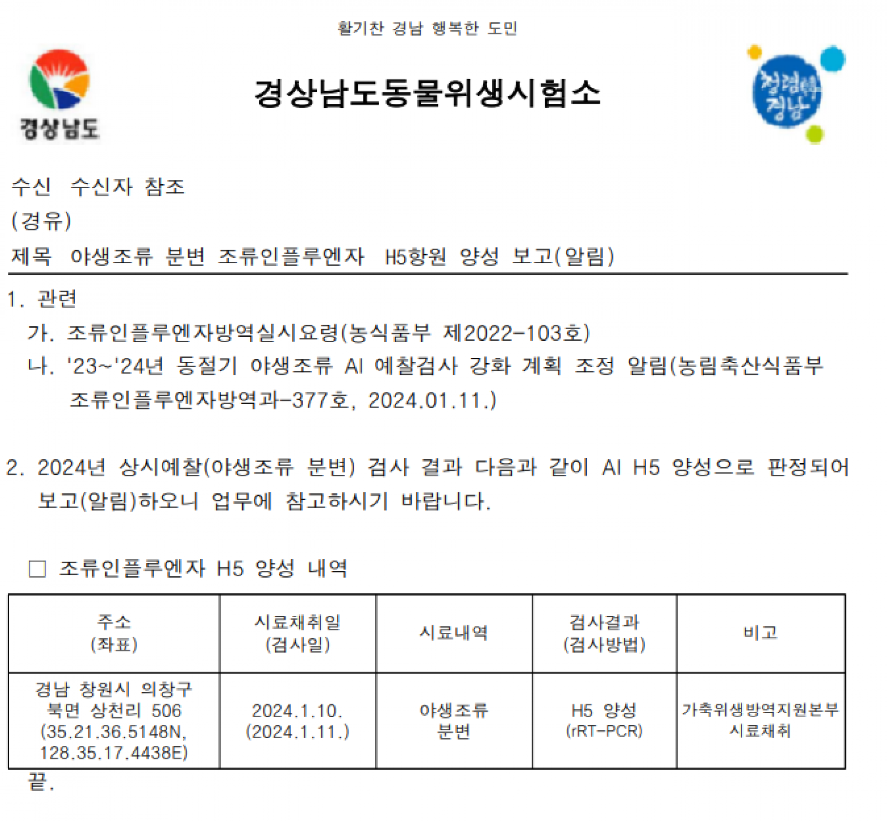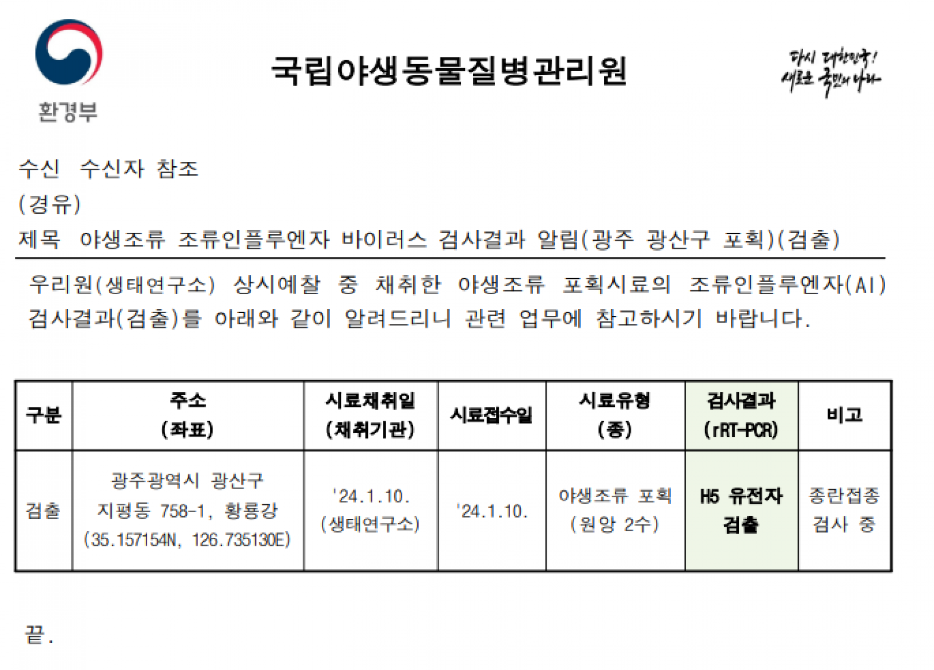 (광주, 경남 창원) 야생조류 H5형 조류인플루엔자(AI) 항원 검출에 따른 차단방역 및 예찰 강화 알림