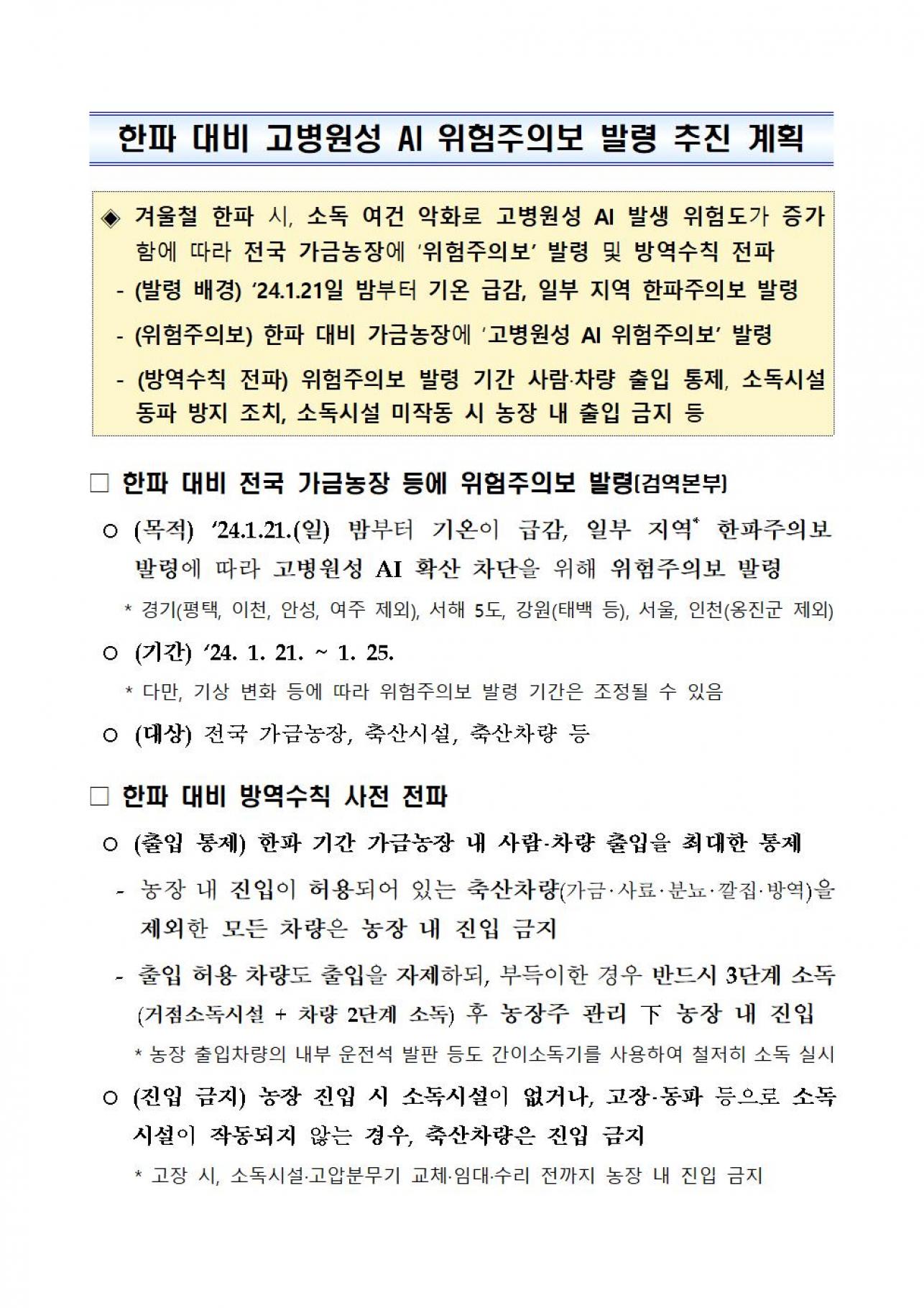 | 240121 한파 대비 고병원성 AI 위험주의보 발령 계획.hwp | |||