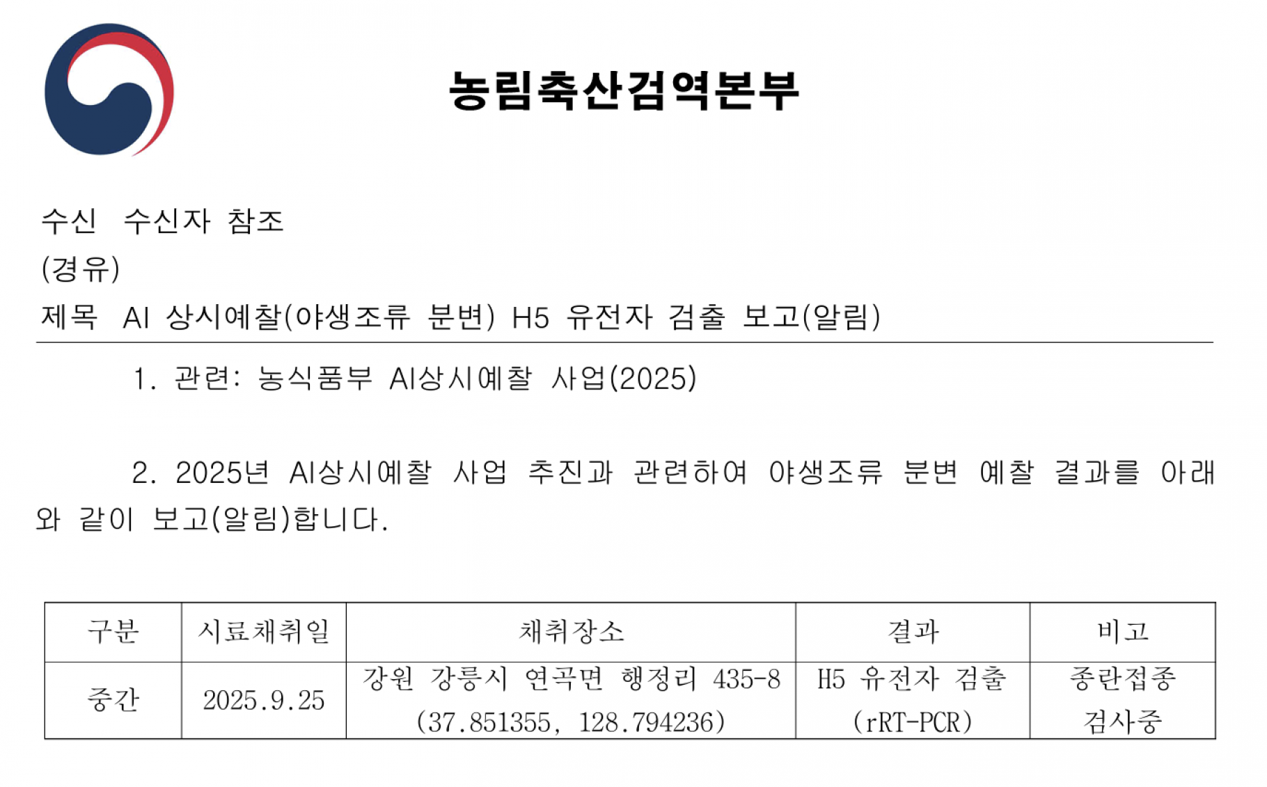 (강원도 강릉) 야생조류 조류인플루엔자(H5) 항원 검출에 따른 차단방역 및 예찰 강화 알림