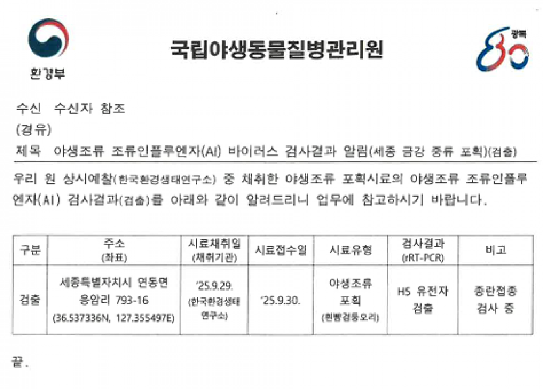 (세종시) 야생조류 조류인플루엔자(H5) 항원 검출에 따른 차단방역 및 예찰 강화 알림 |