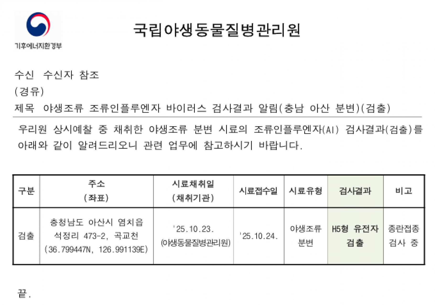 (충남 아산시) 야생조류 조류인플루엔자(H5형) 항원 검출에 따른 차단방역 및 예찰 강화 알림