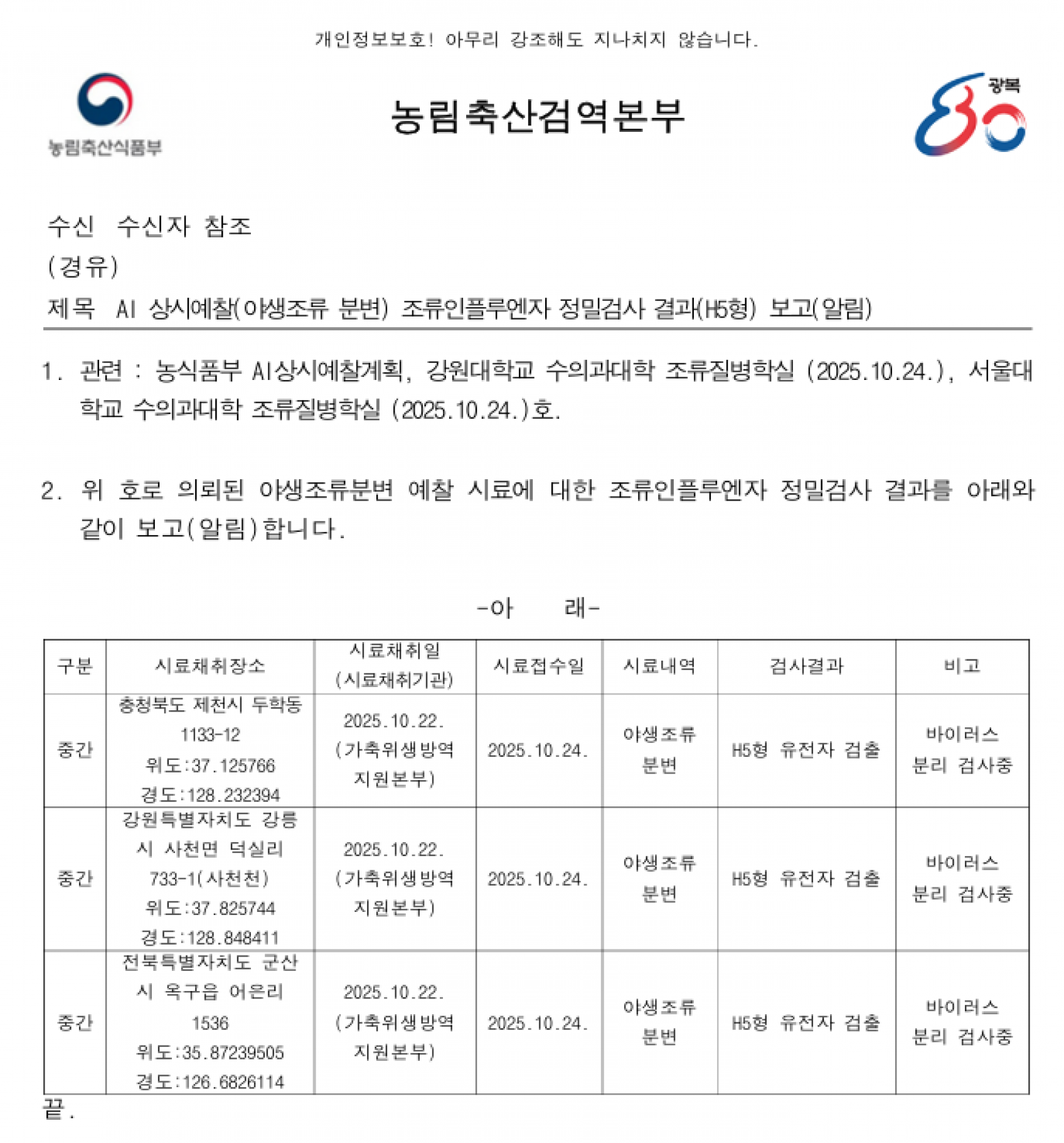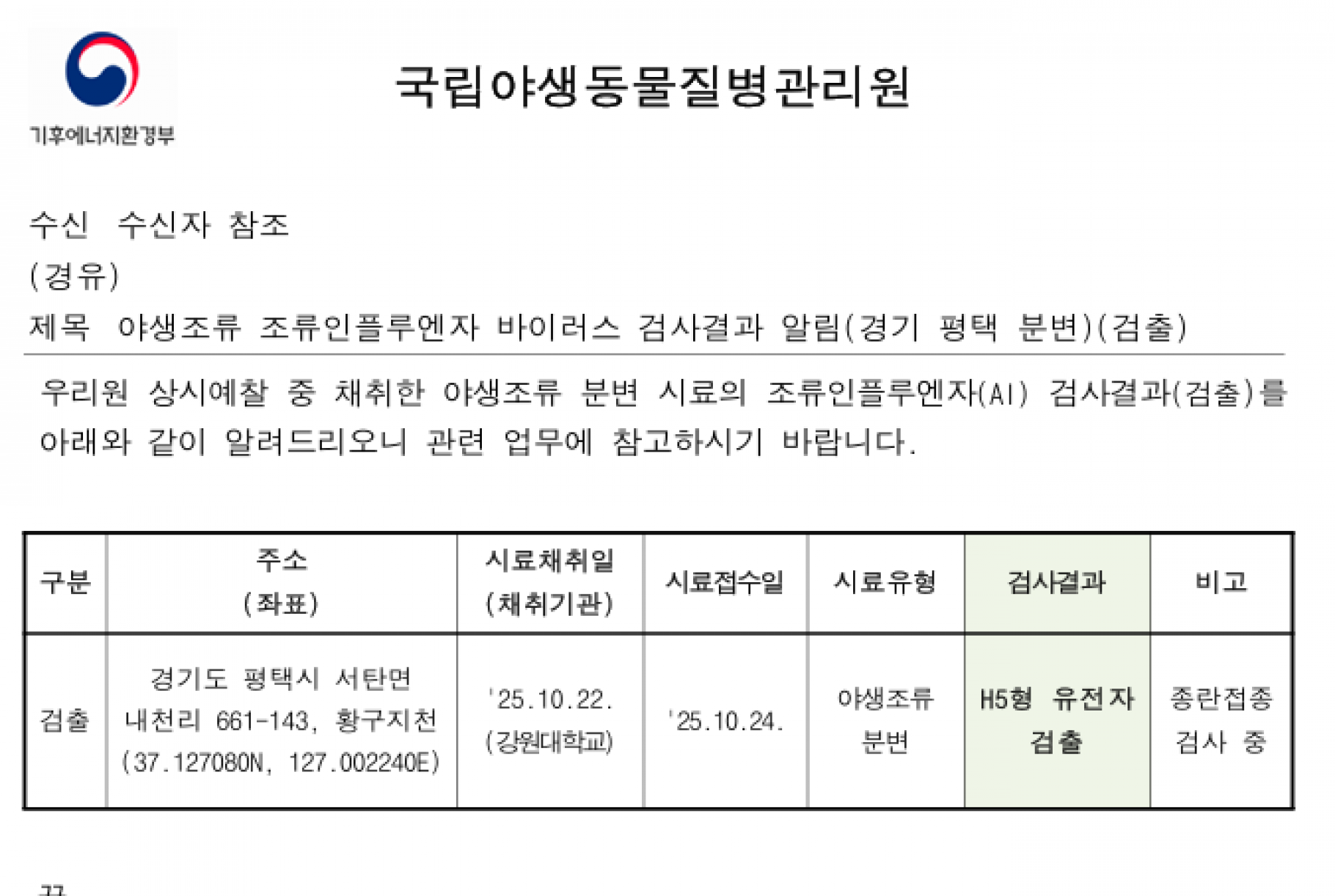 (강원도 강릉, 경기도 평택, 전북 군산, 충북 제천) 야생조류 조류인플루엔자(H5형) 항원 검출에 따른 차단방역 및 예찰 강화 알림