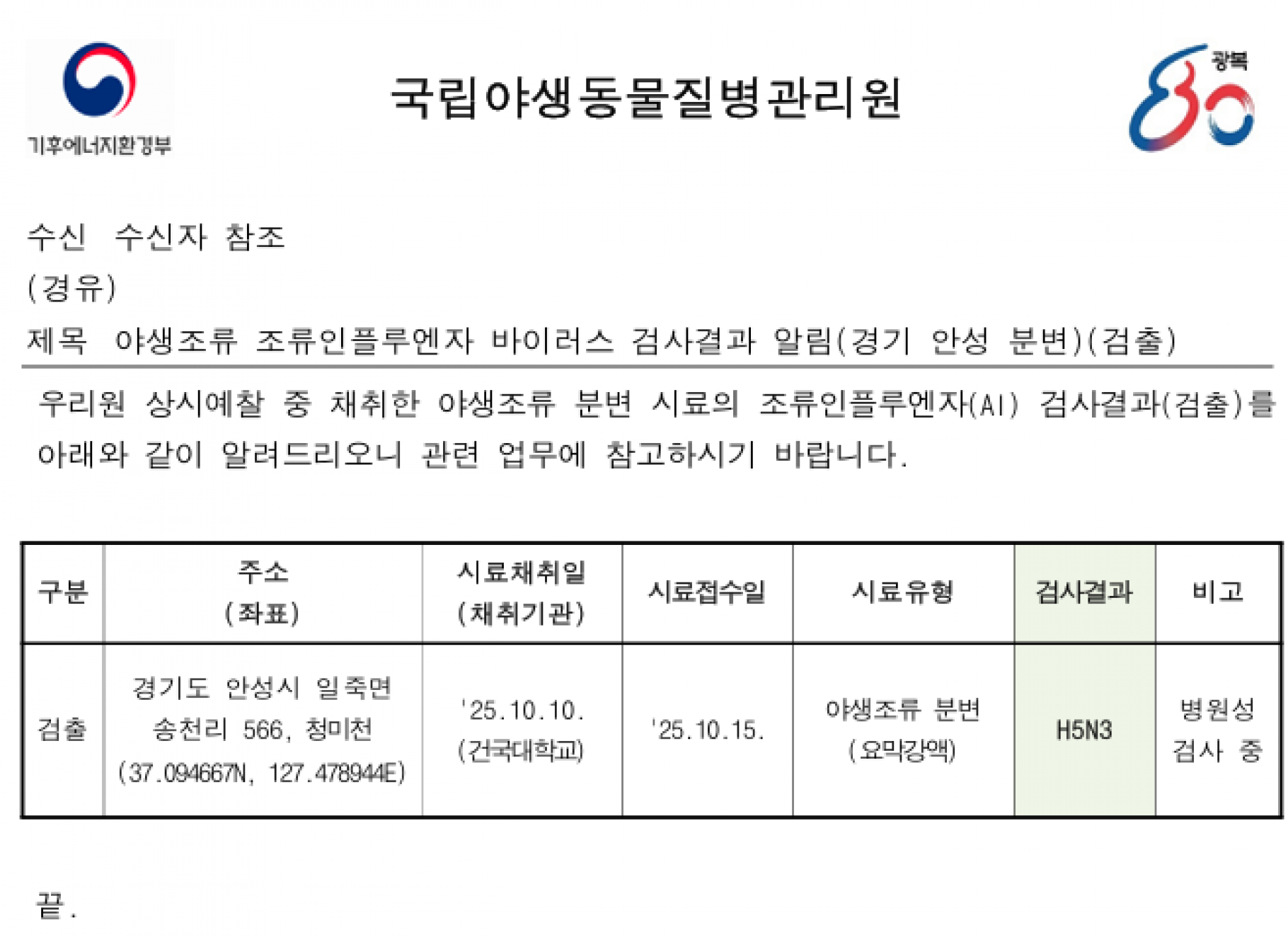 (경기도 안성) 야생조류 조류인플루엔자(H5)항원 검출에 따른 차단방역 강화 알림