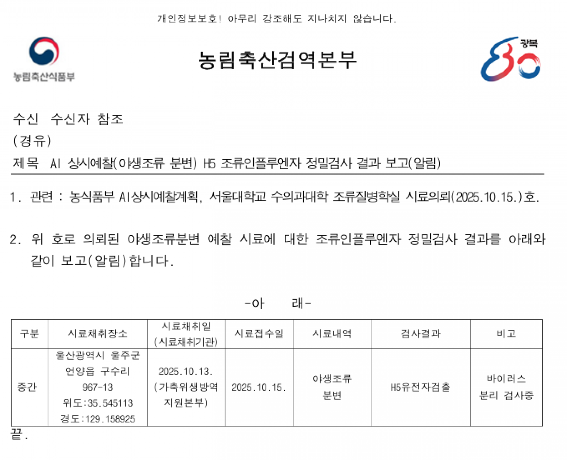 (울산 울주) 야생조류 조류인플루엔자(H5)항원 검출에 따른 차단방역 강화 알림
