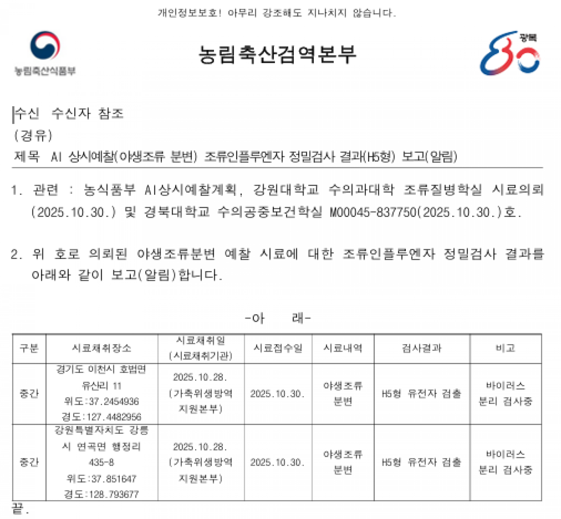 (강원도 강릉, 경기도 이천)야생조류 조류인플루엔자(H5) 항원 검출에 따른 차단방역 및 예찰 강화 알림
