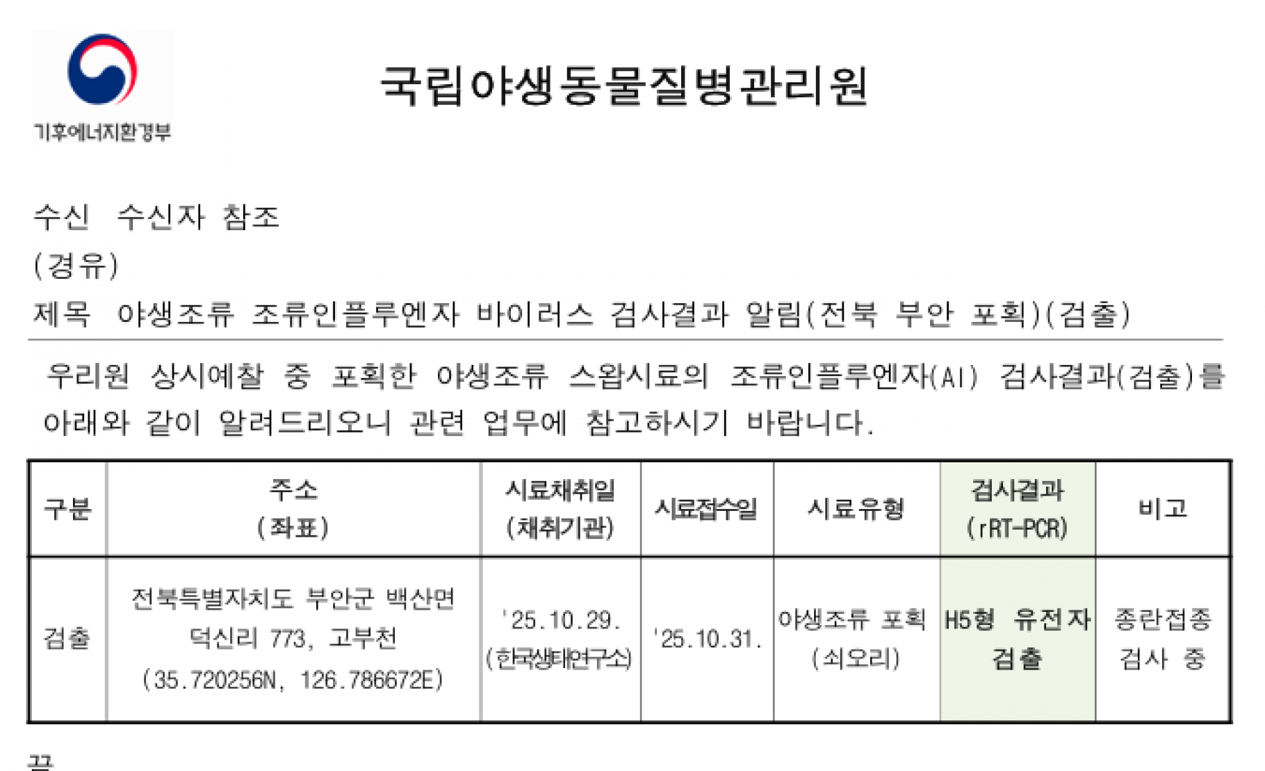 (전북 부안) 야생조류 조류인플루엔자(H5) 항원 검출에 따른 차단방역 및 예찰 강화 알림