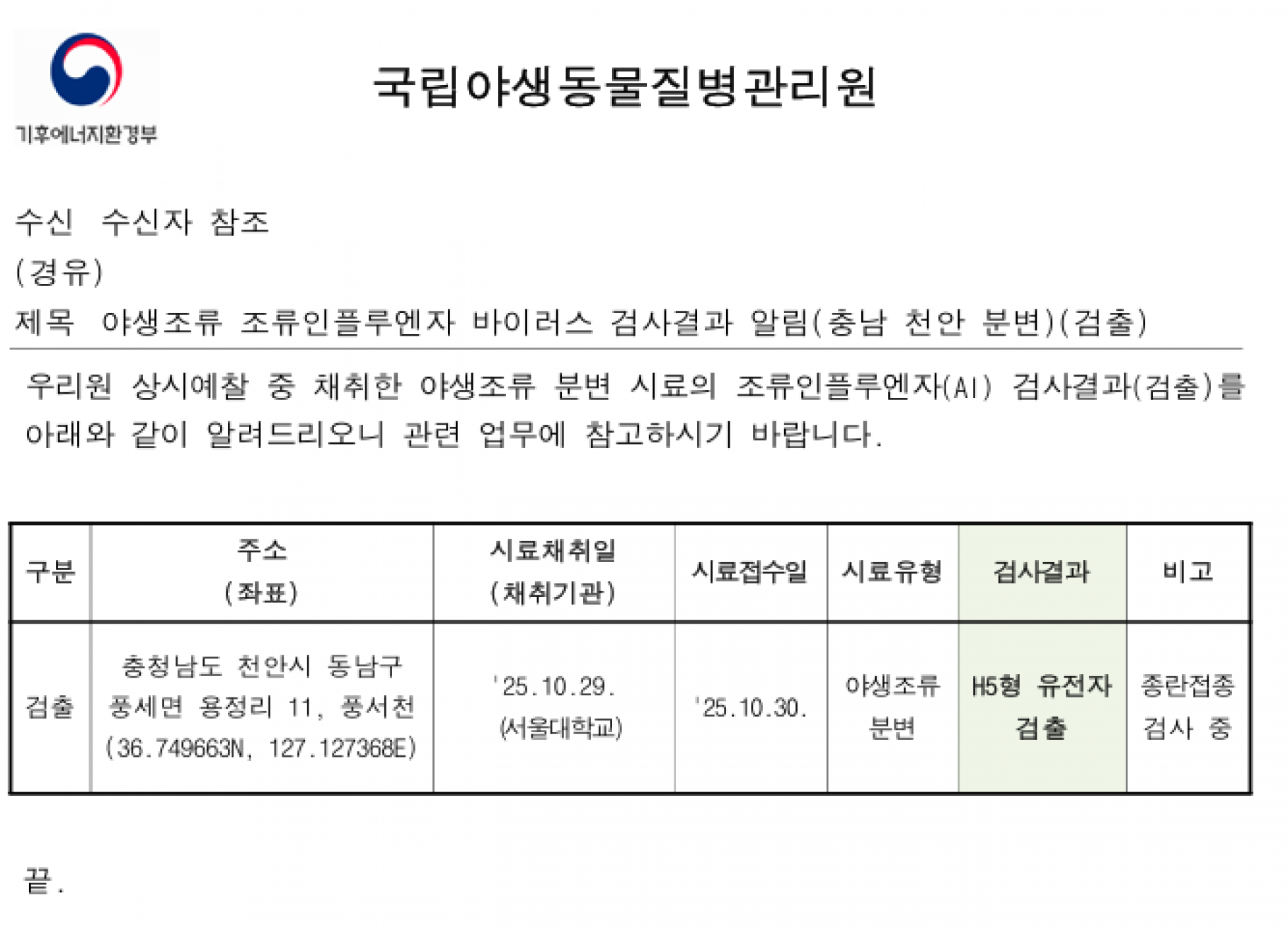 (충남 천안) 야생조류 조류인플루엔자(H5) 항원 검출에 따른 차단방역 및 예찰 강화 알림