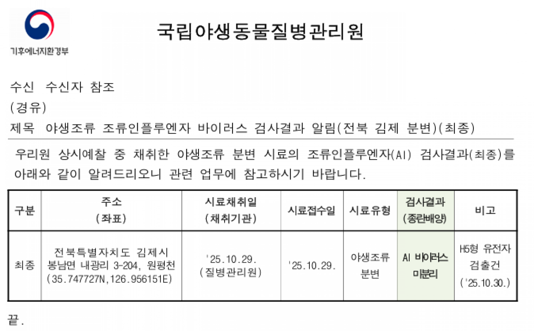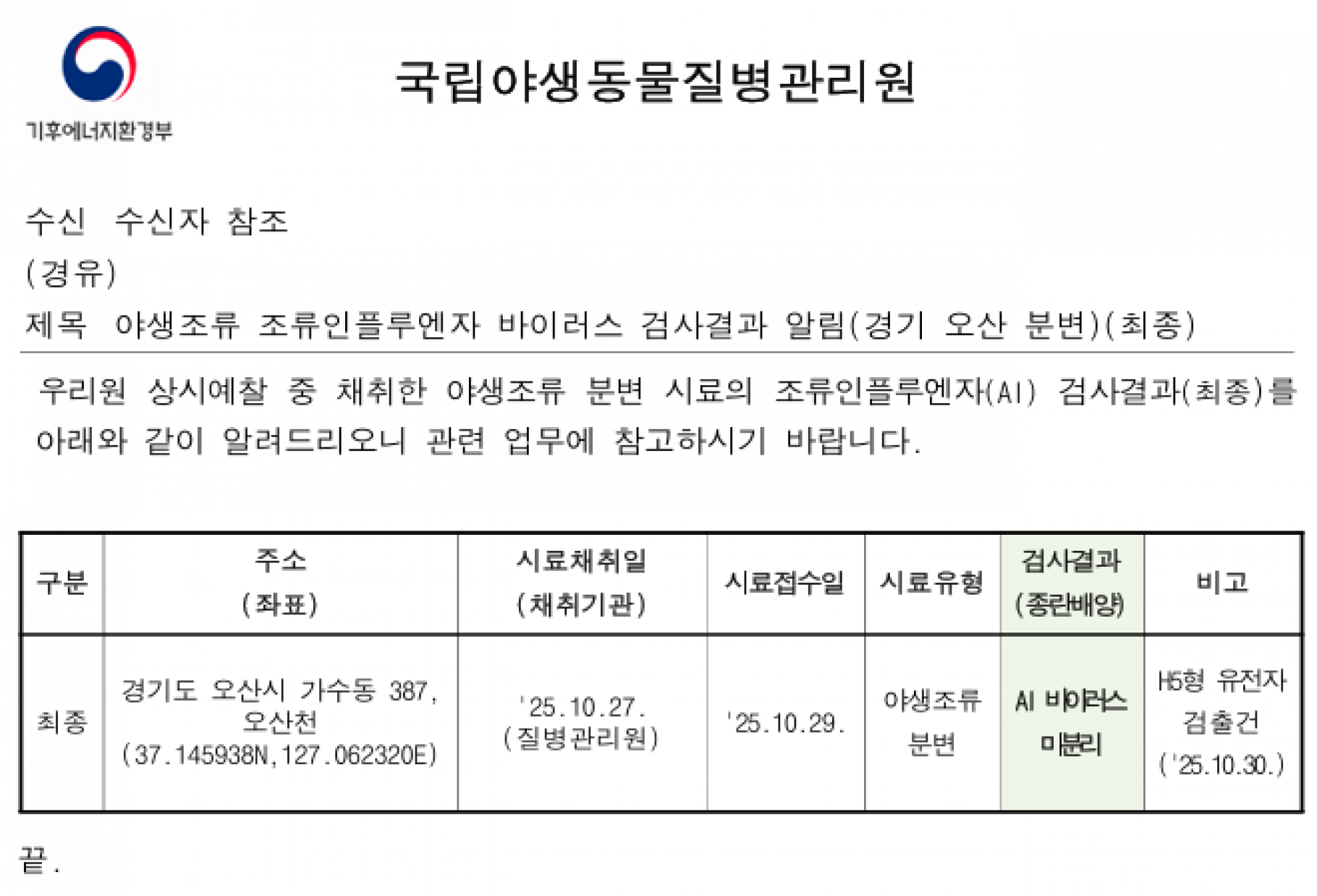 경기(안성), 경기(오산), 경기(이천) 및 전북(김제) 소재 야생조류 AI 항원 미분리 지점 관리