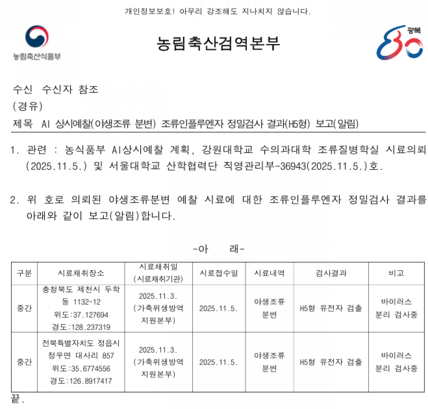 (충남 천안, 아산, 충북 제천, 전북 정읍) 야생조류 조류인플루엔자(H5) 항원 검출에 따른 차단방역 및 예찰 강화 알림