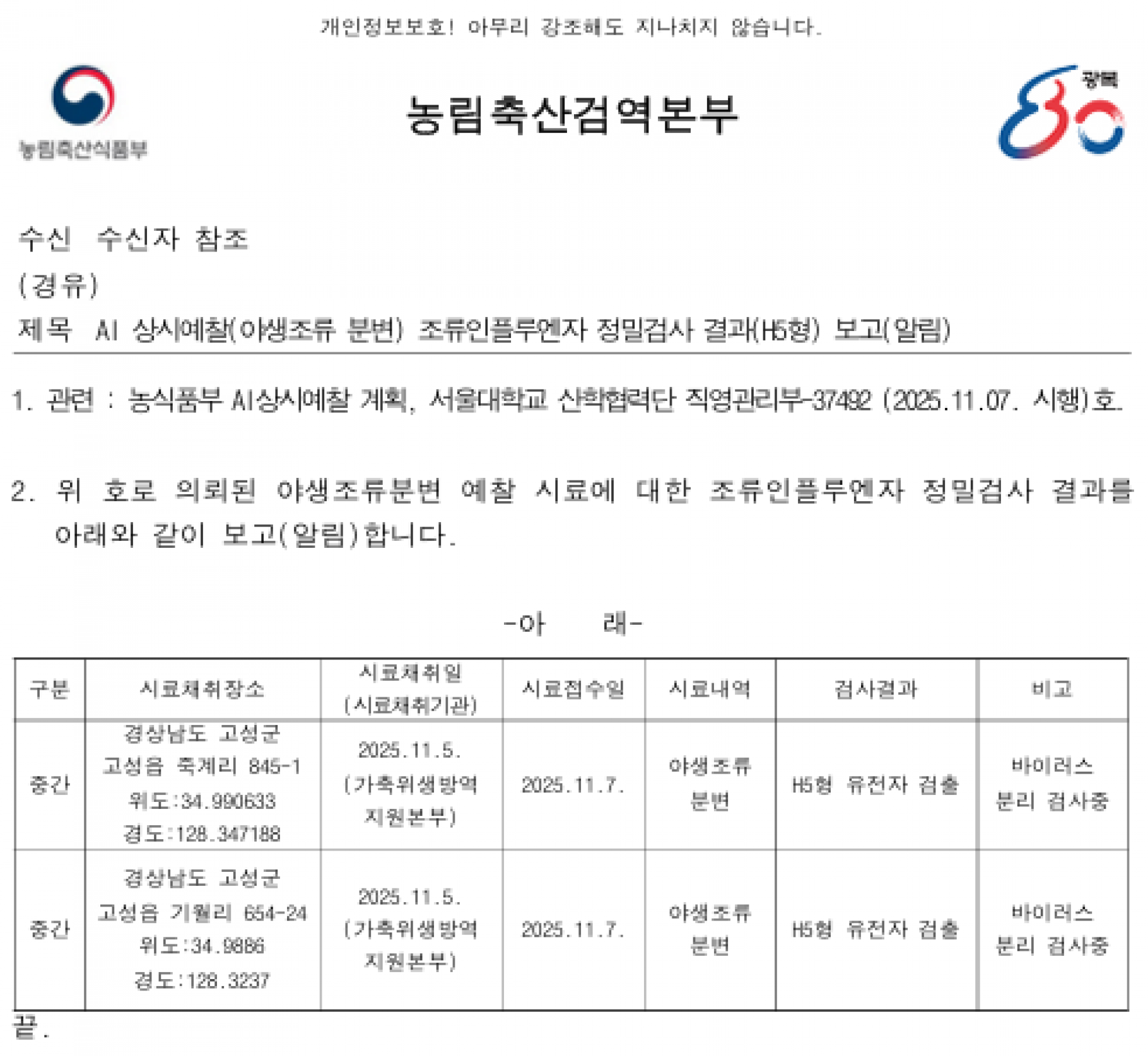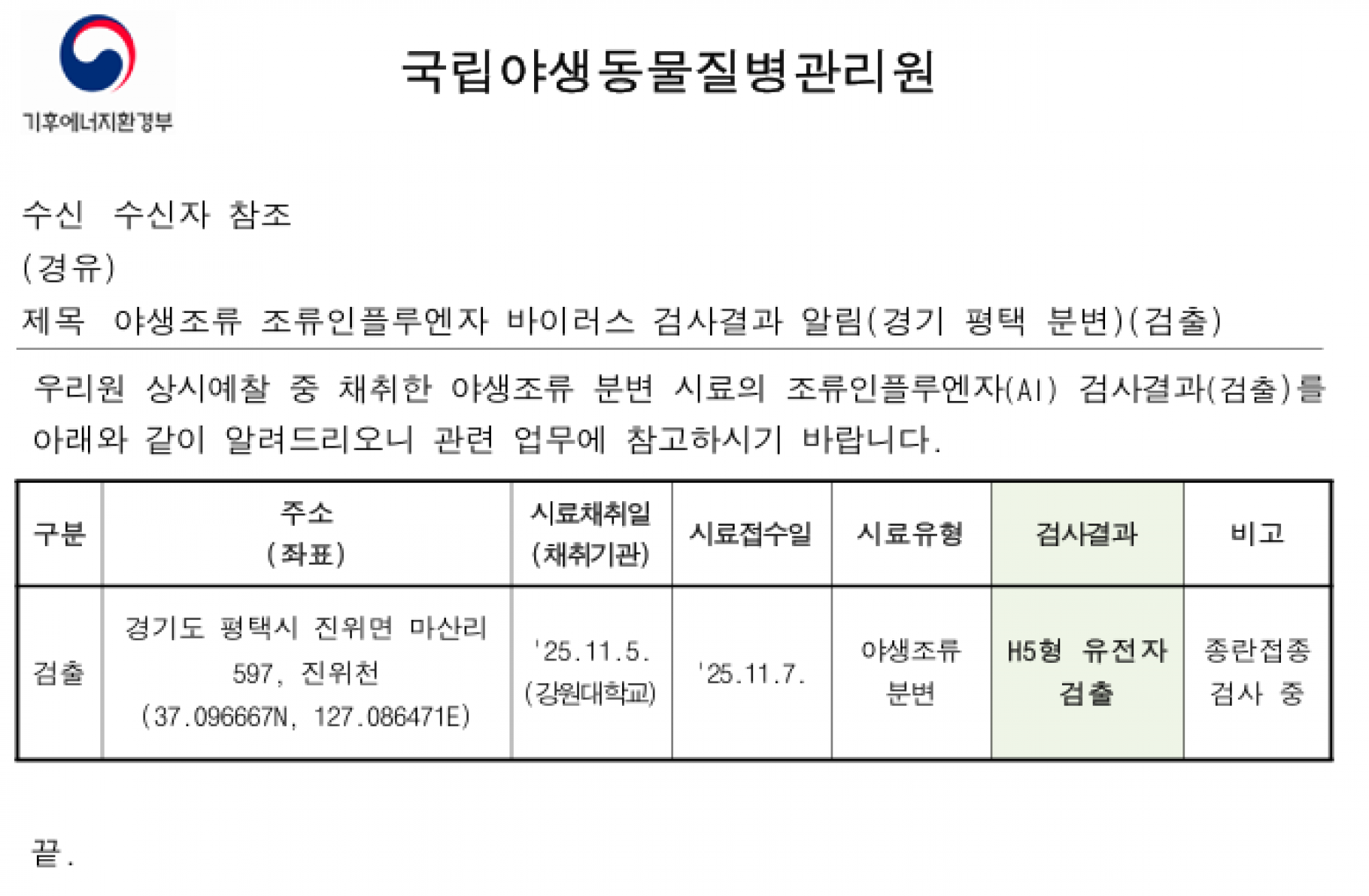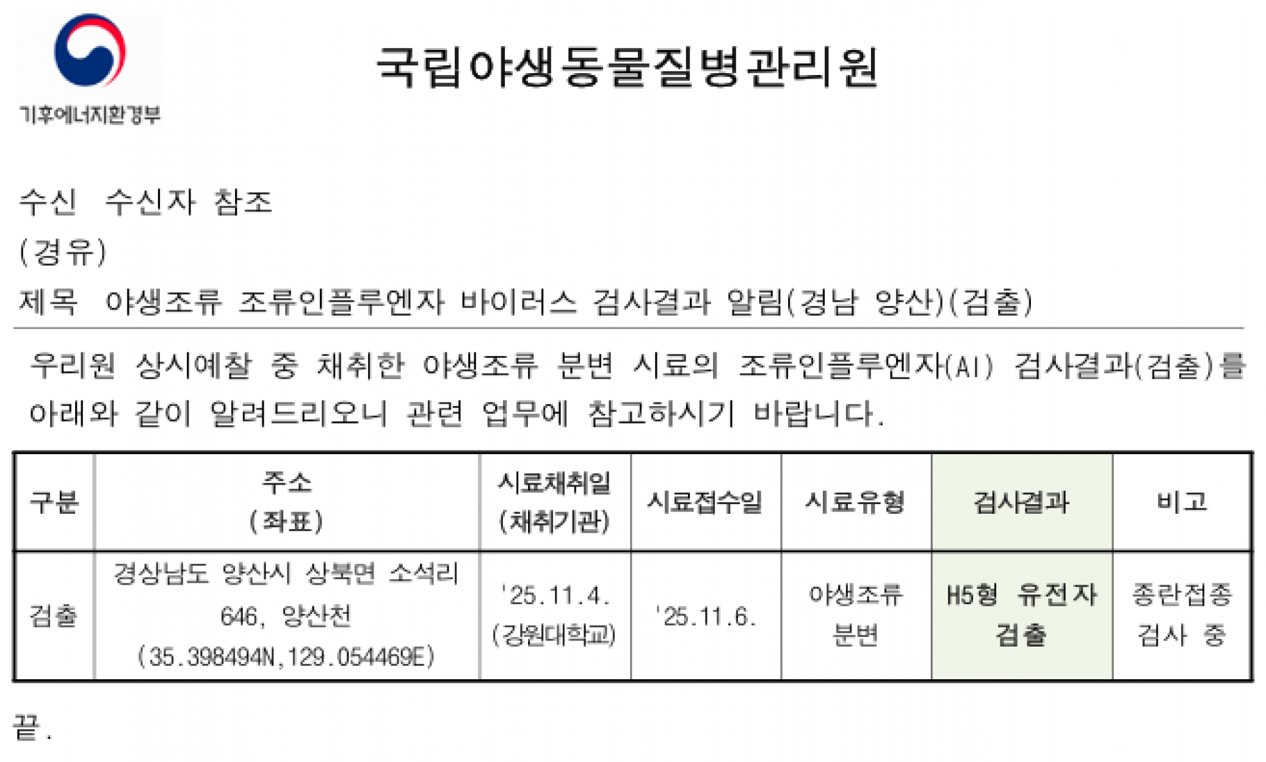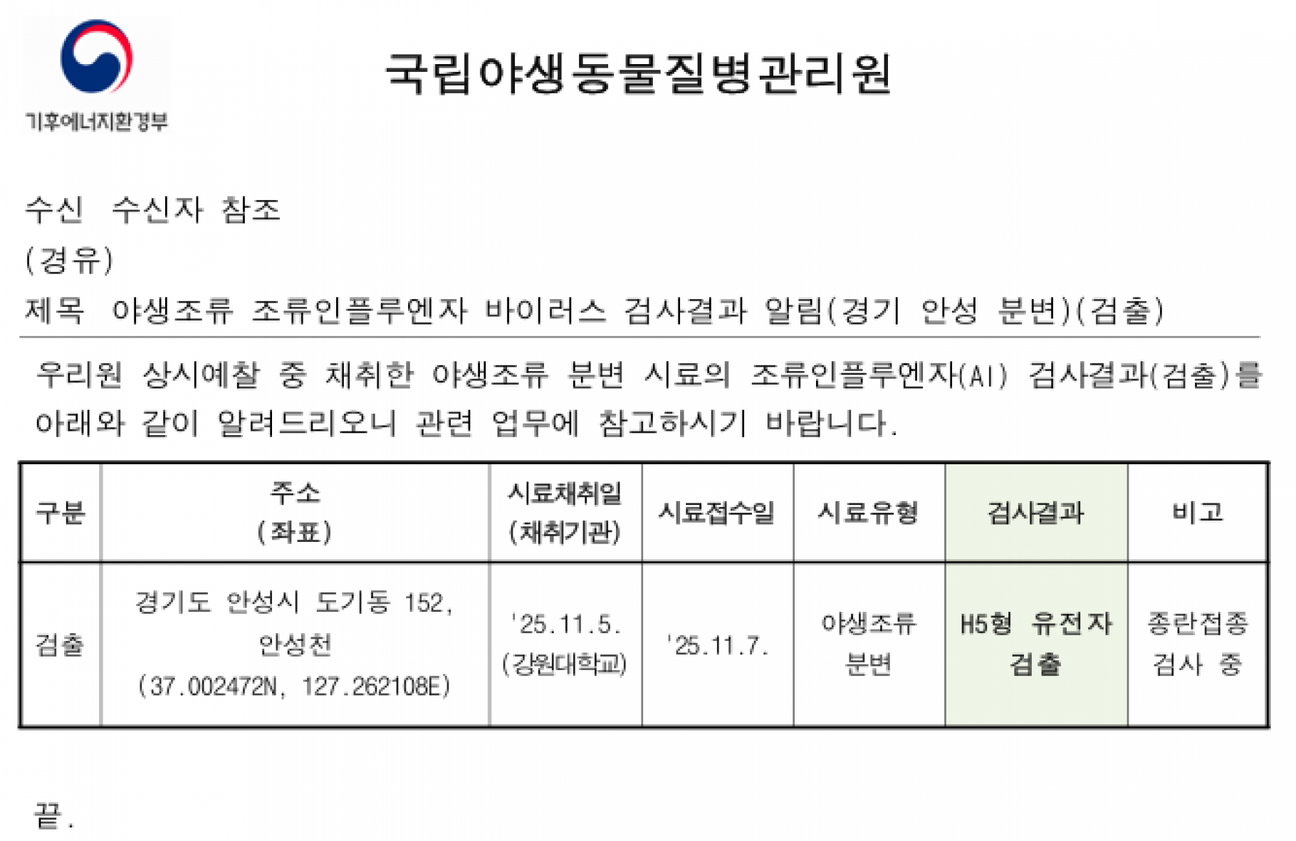 (경남 고성, 경기 안성, 경기 평택. 경남 양산)야생조류 조류인플루엔자(H5) 항원 검출에 따른 차단방역 및 예찰 강화 알림