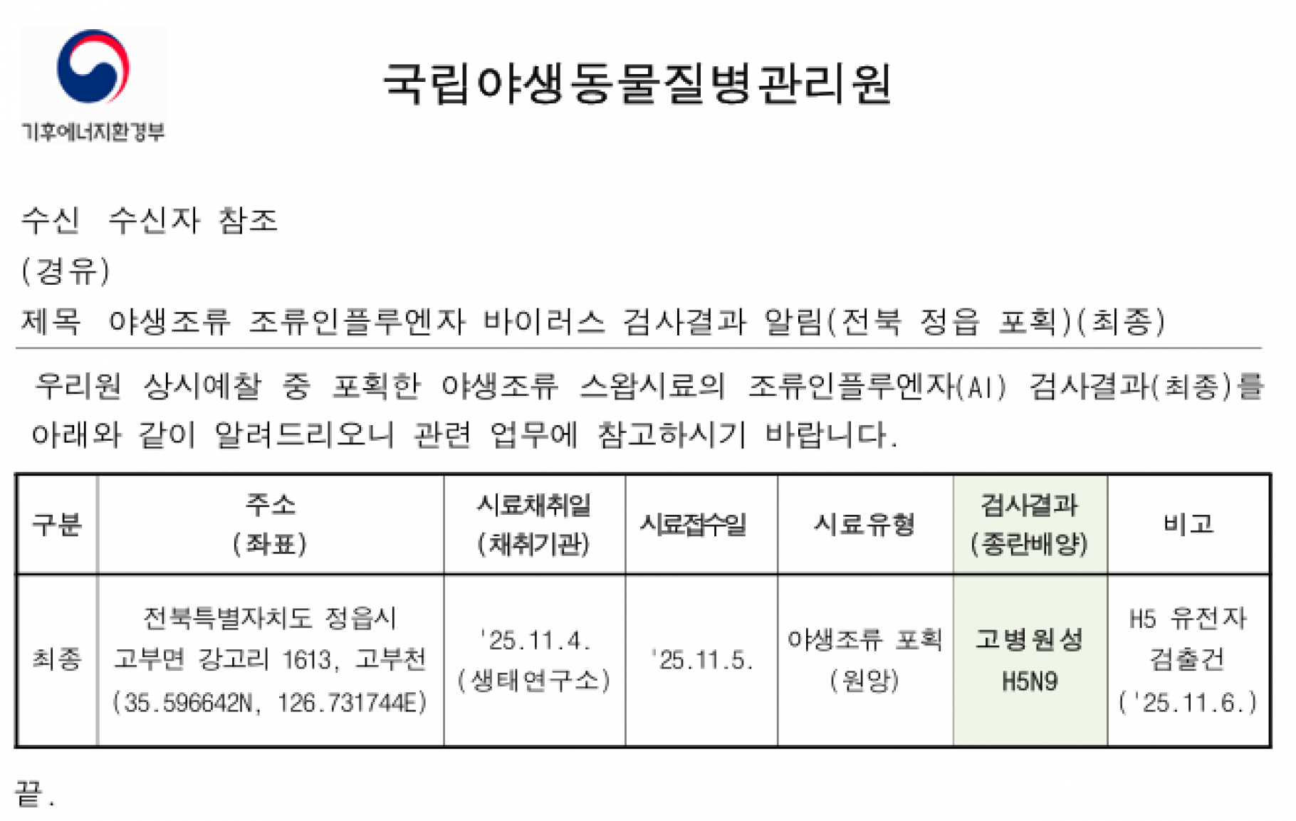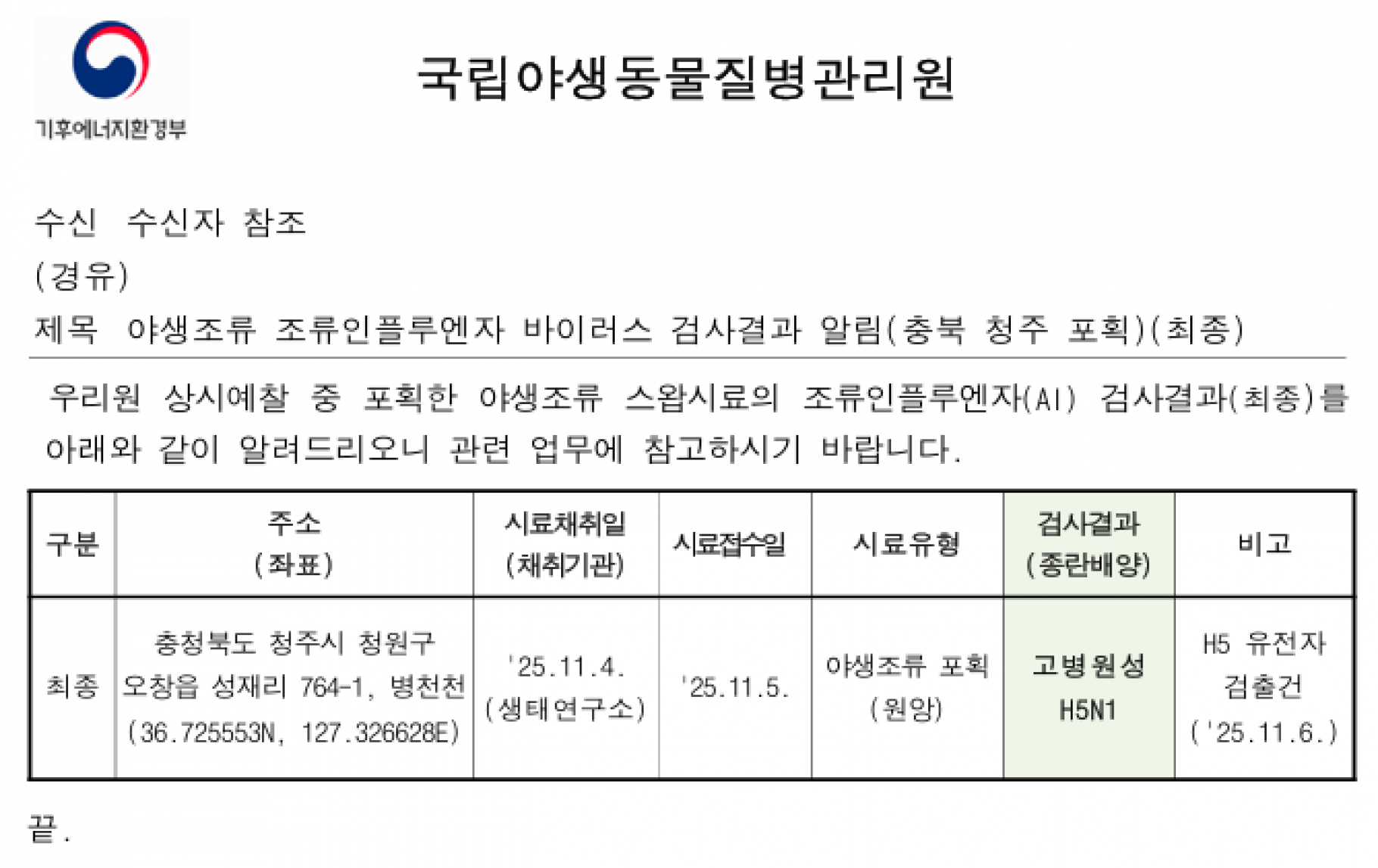 (전북 정읍, 충북 청주)야생조류 고병원성 조류인플루엔자(H5형) 검출에 따른 차단방역 강화 알림