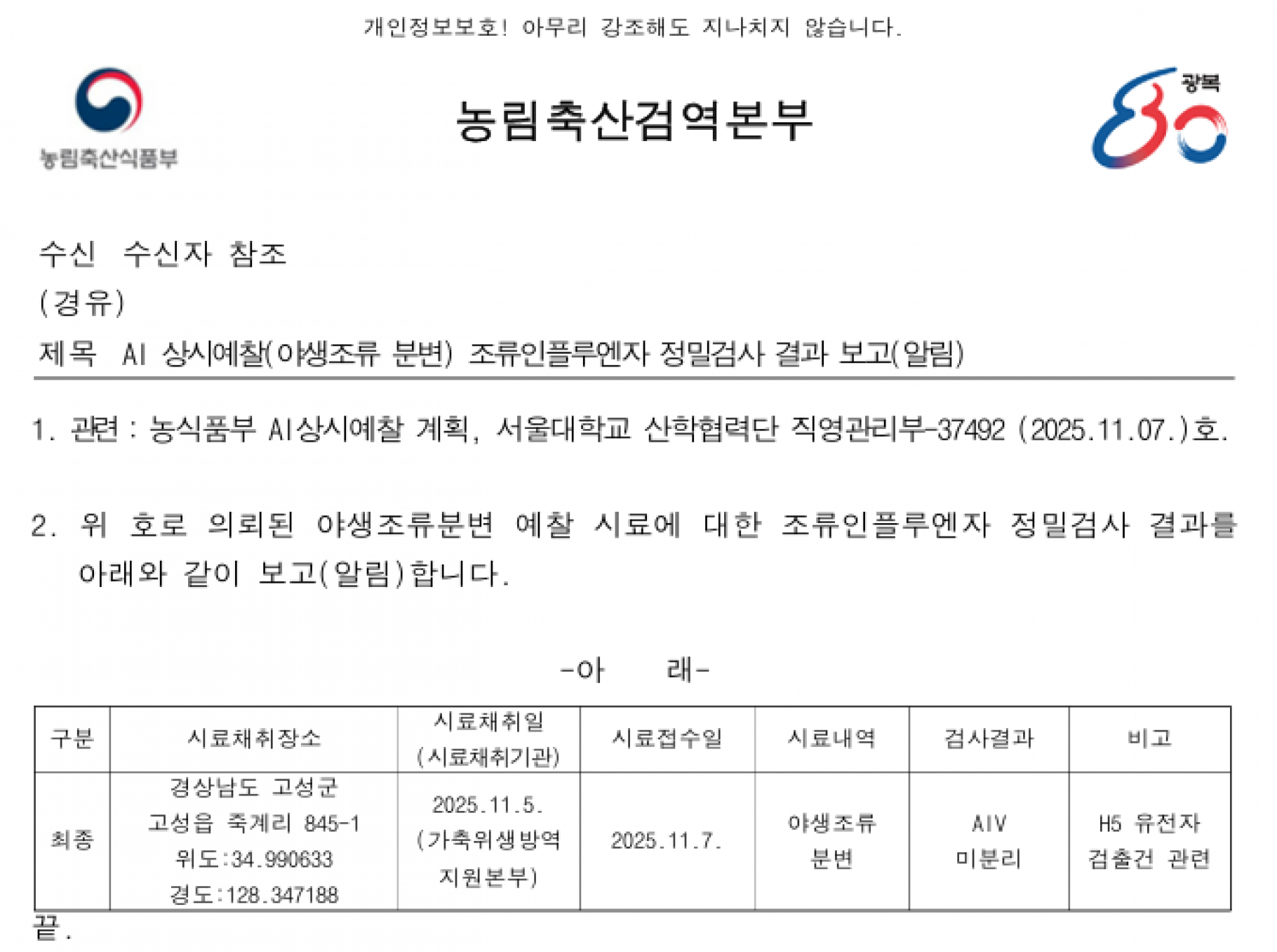 경남(고성) 소재 야생조류 AI 항원 미분리 지점 관리에 대한 후속조치 알림