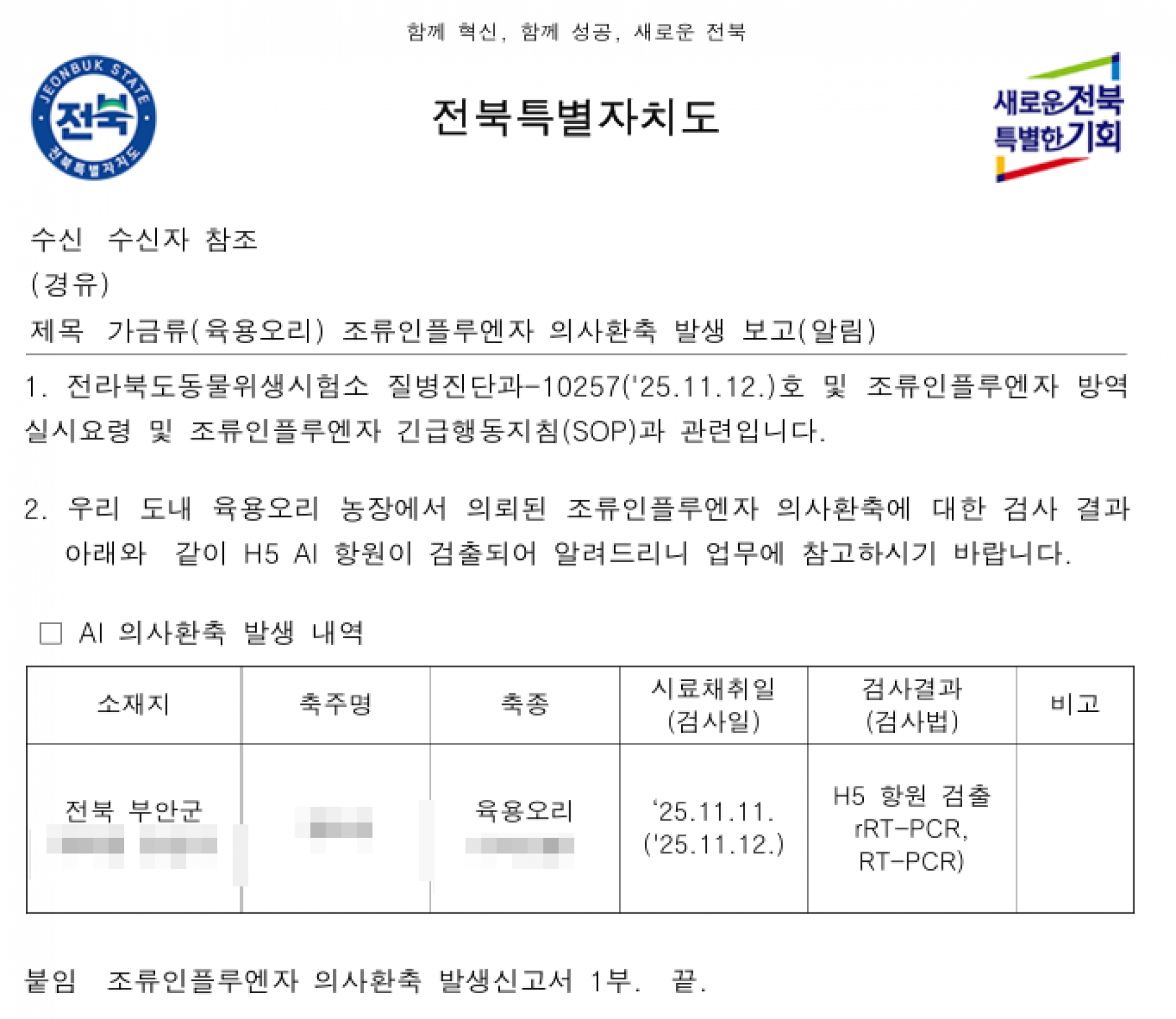 전북 부안 가금농장(육용오리) 고병원성 AI 의사환축 발생에 따른 방역강화 조치