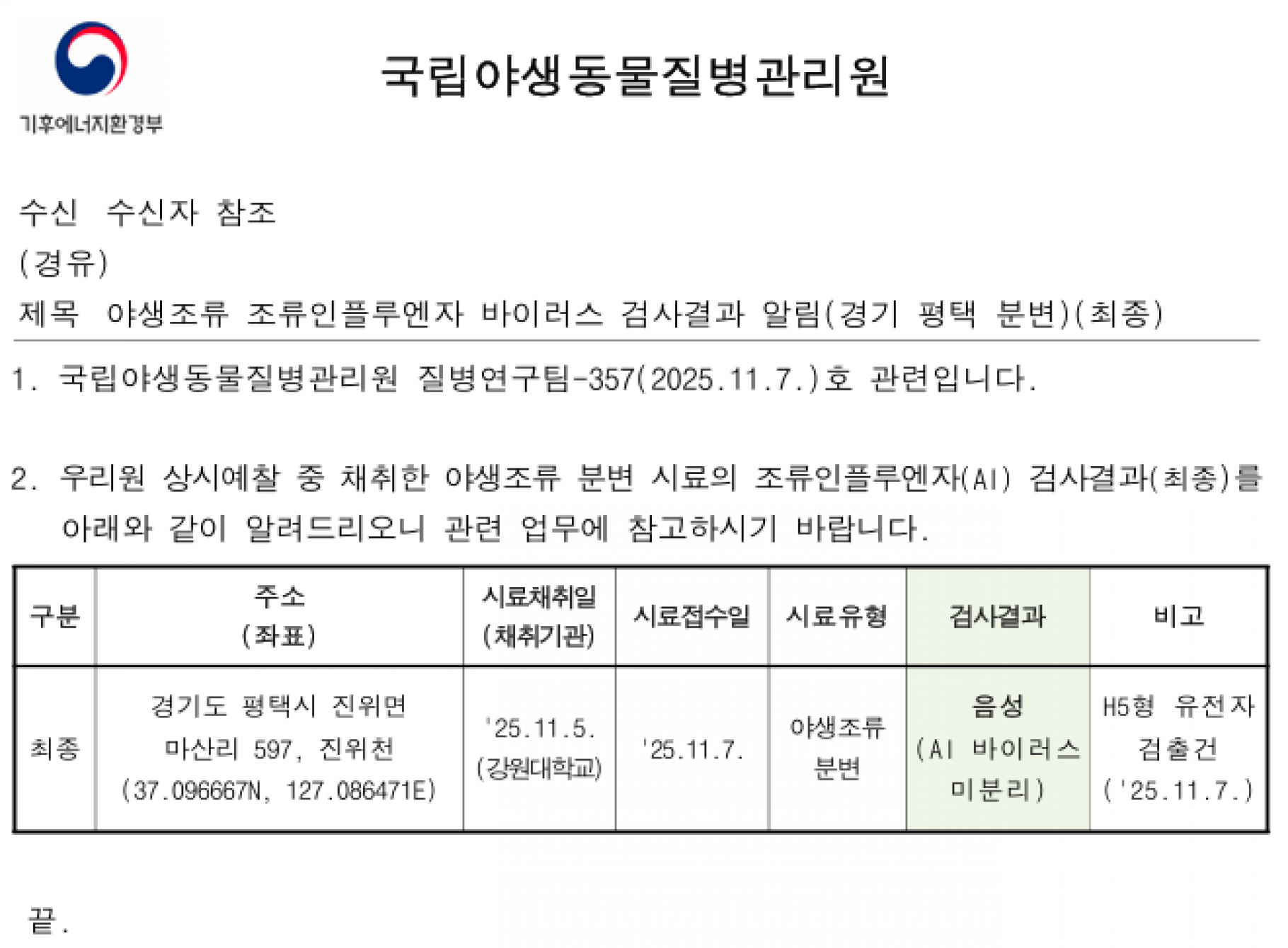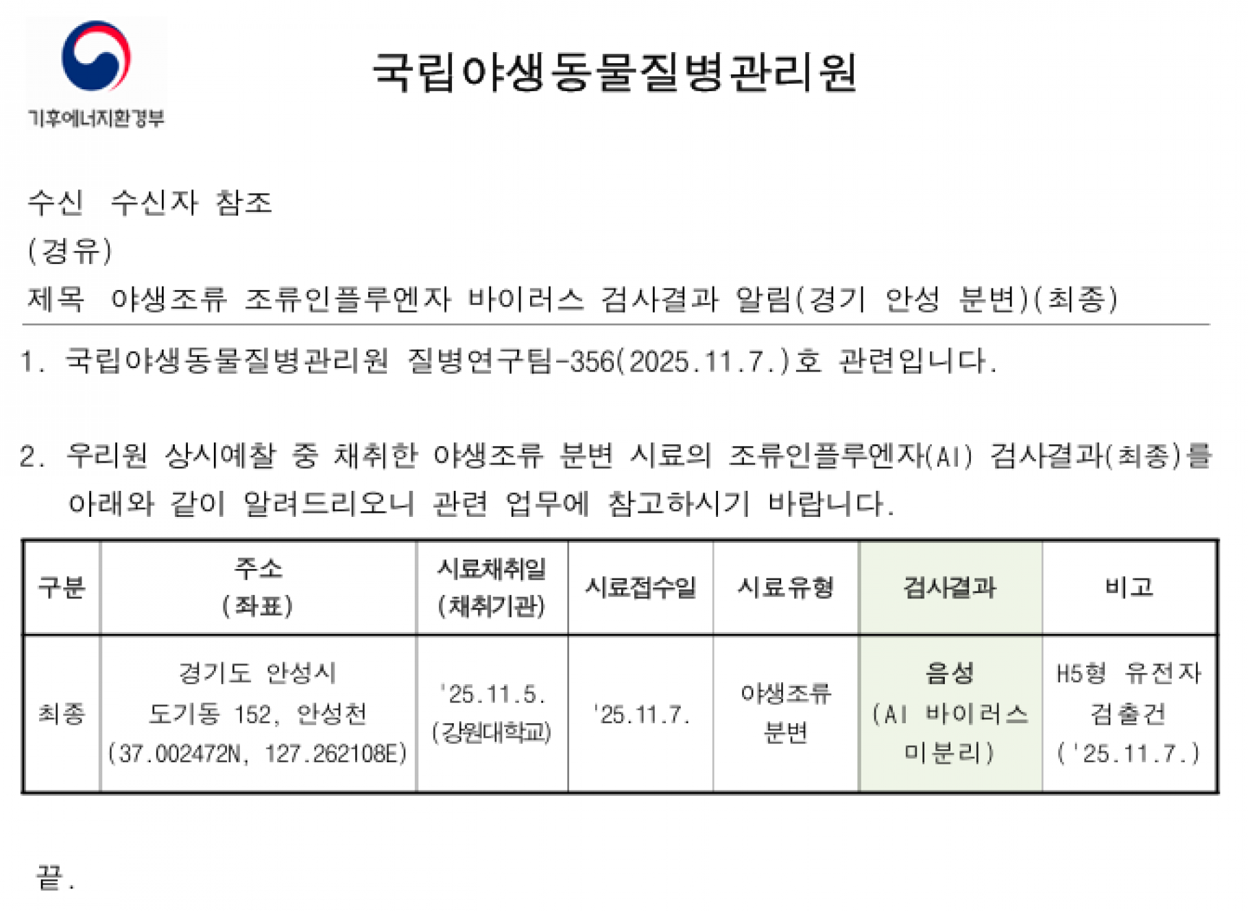 경기(평택) 및 경기(안성) 소재 야생조류 AI 항원 미분리 지점 관리에 대한 후속조치 알림