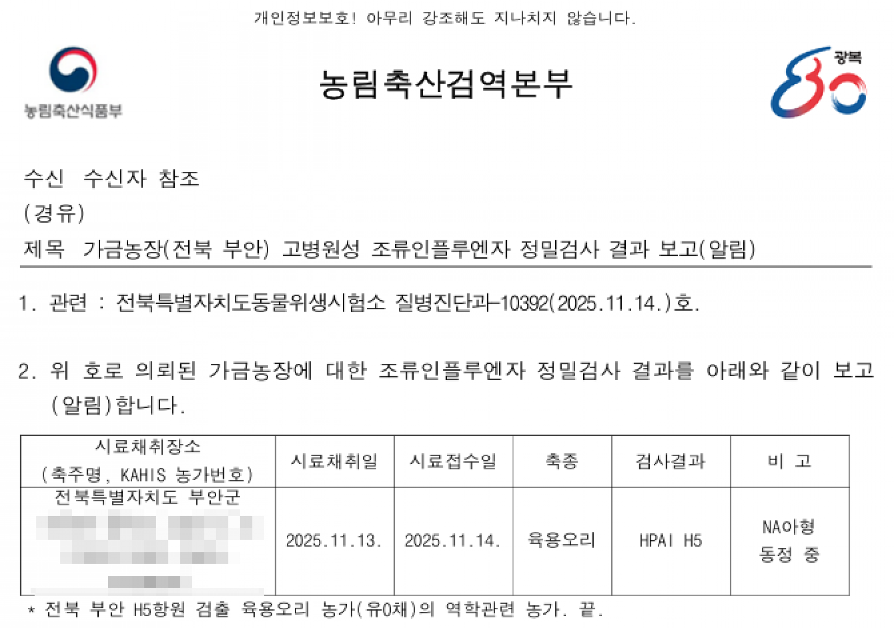 전북 부안군 예방적 살처분 가금농장(육용오리) 고병원성 조류인플루엔자(AI) 확진에 따른 방역조치 알림