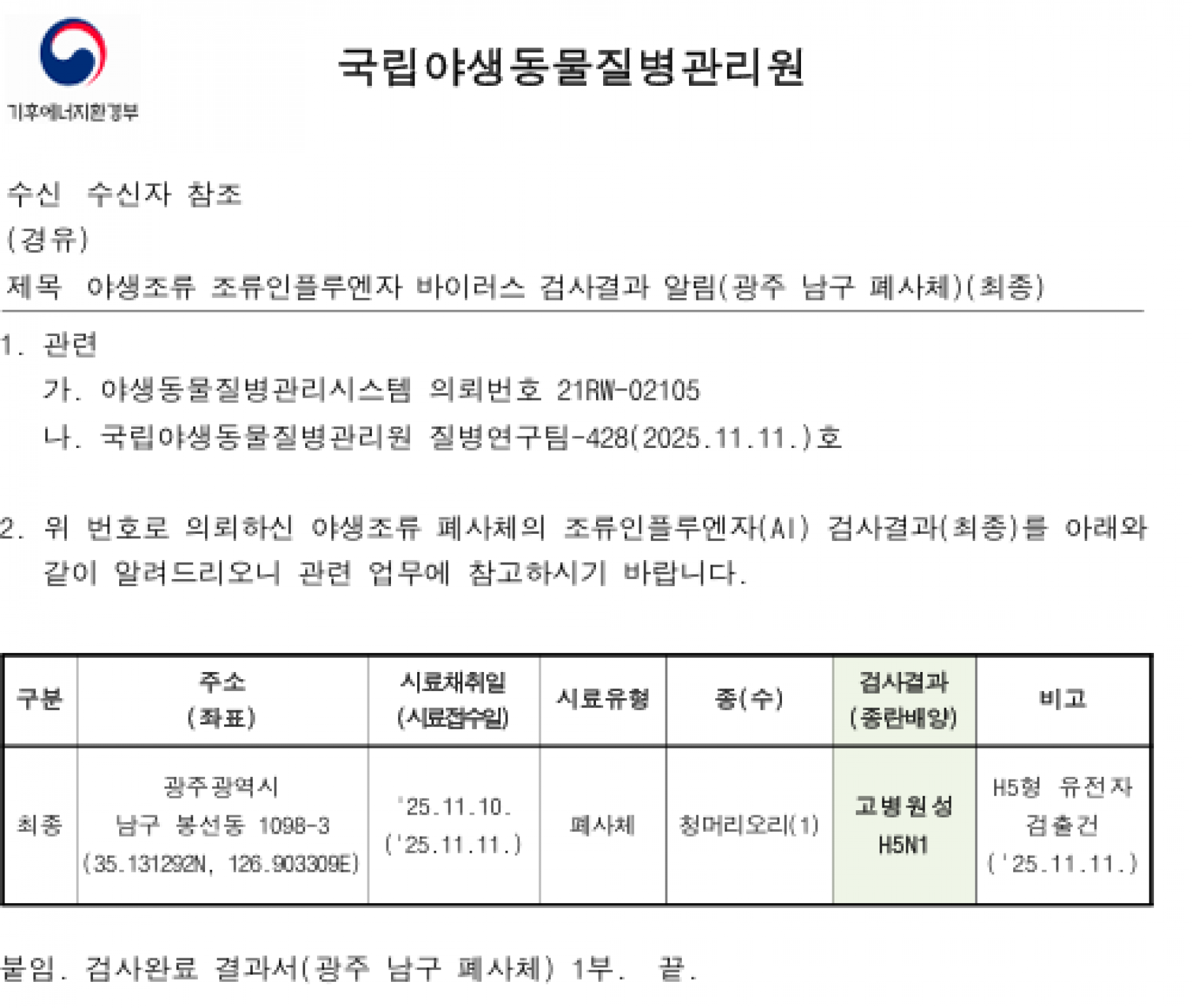 (광주 남구) 야생조류 고병원성 조류인플루엔자(H5형) 검출에 따른 차단방역 강화 알림