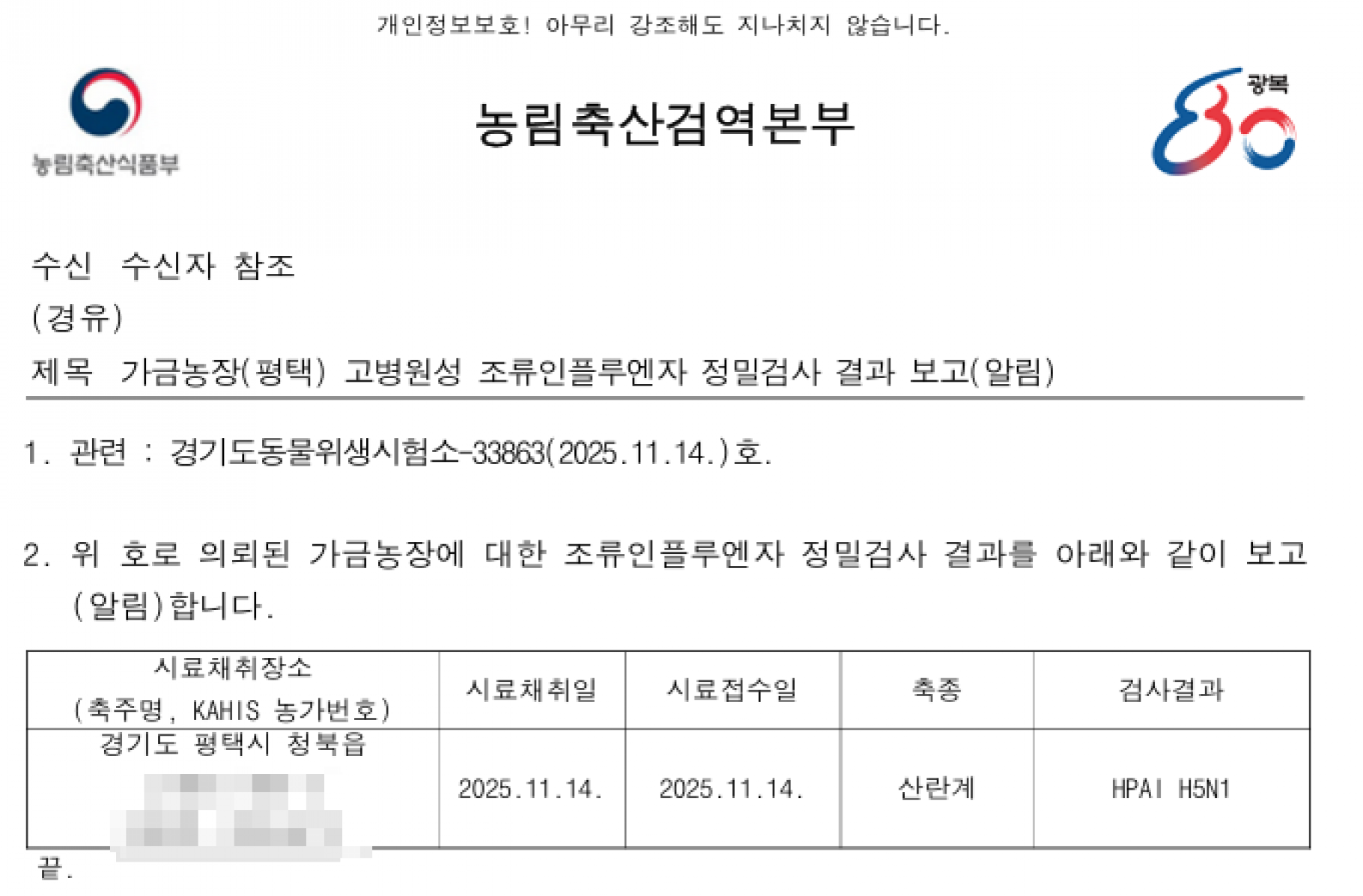 경기 평택 가금농장(산란계) 고병원성 조류인플루엔자(AI) 확진에 따른 방역조치 알림