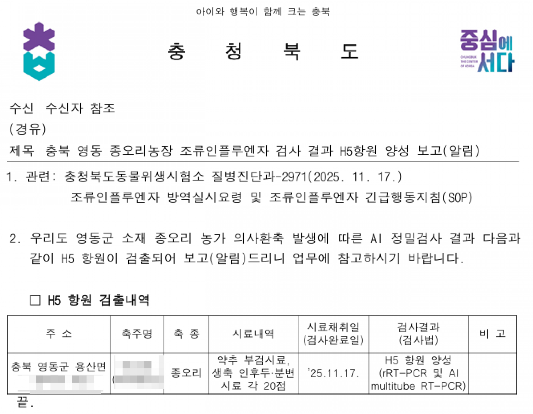 충북 영동 가금농장(종오리) 고병원성 AI 의사환축 발생에 따른 방역강화 조치