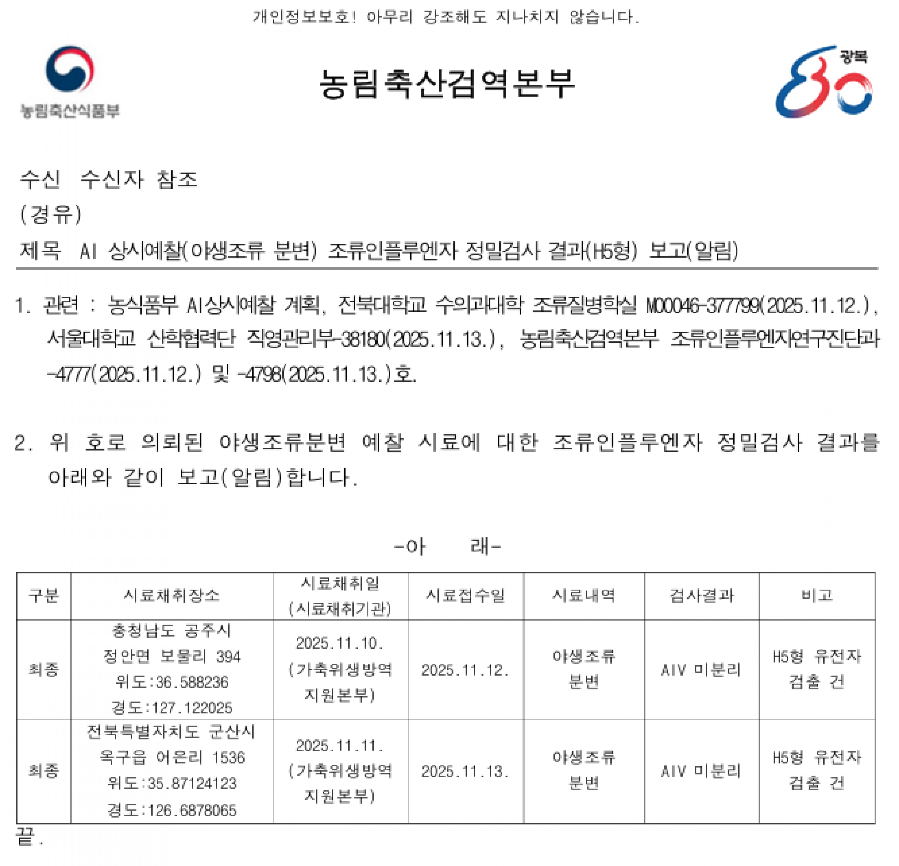 충남(공주) 및 전북(군산) 소재 야생조류 AI 항원 미분리 지점 관리에 대한 후속조치 알림