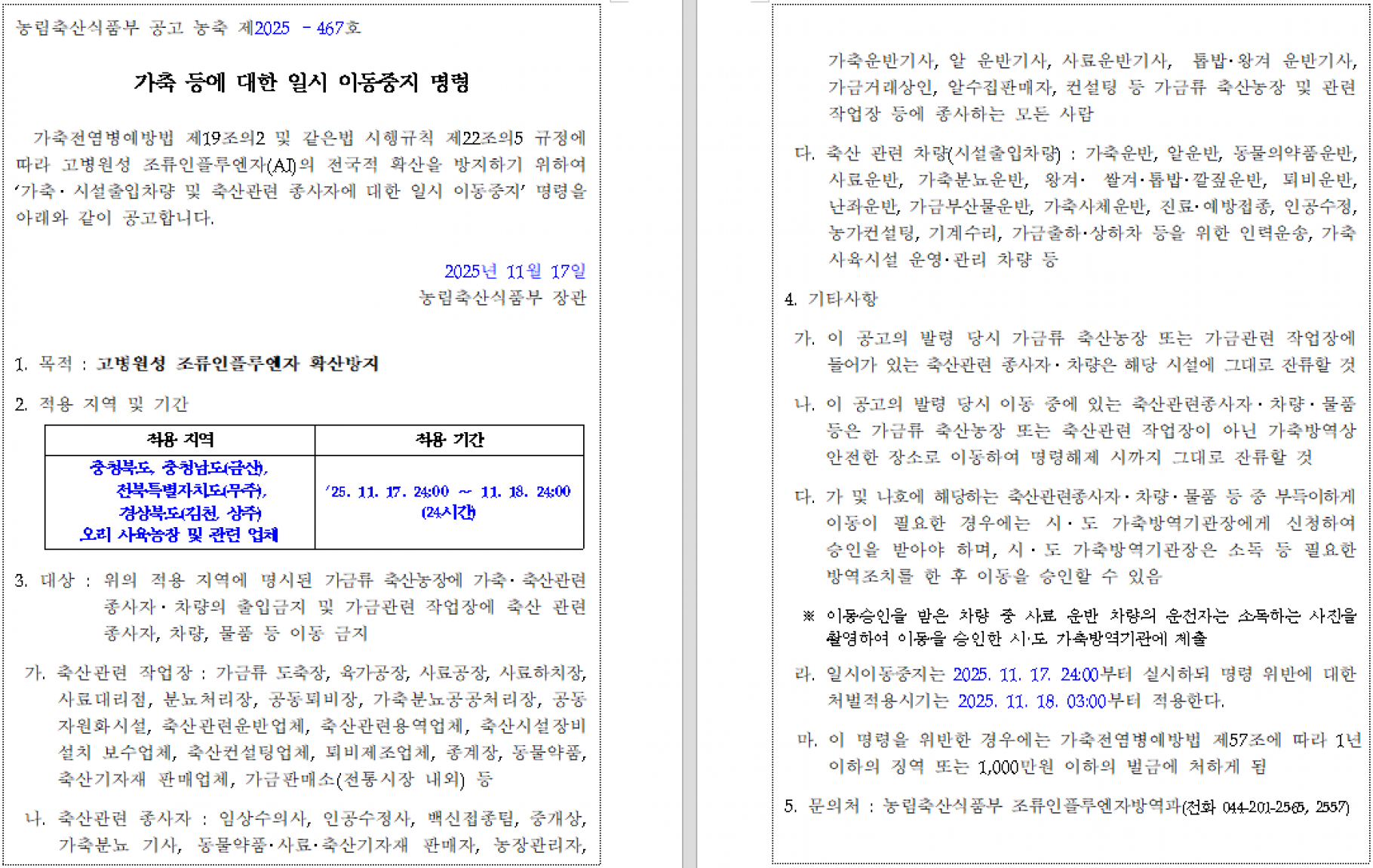 가축(오리) 등에 대한 일시 이동중지(Standstill) 명령 발령 알림