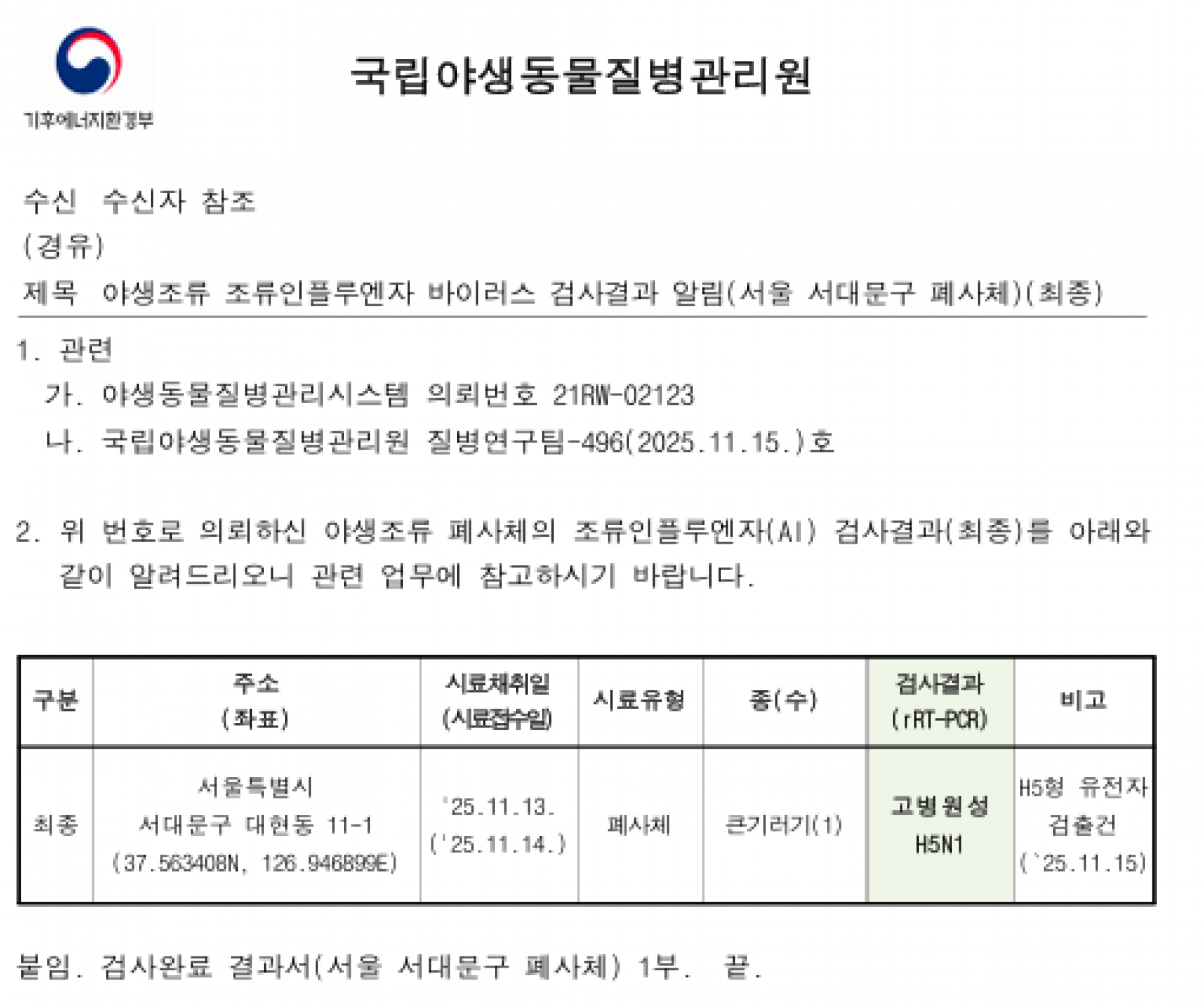 (서울시) 야생조류 고병원성 조류인플루엔자(H5형) 검출에 따른 차단방역 강화 알림