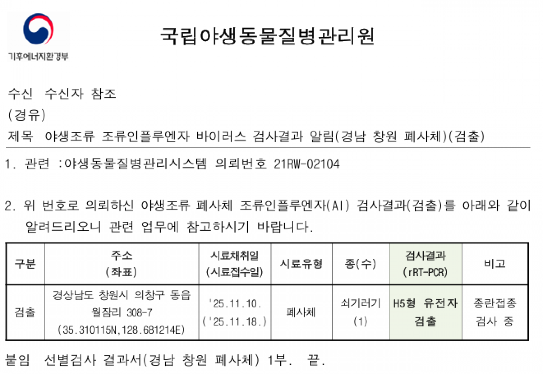 (경남 창원) 야생조류 조류인플루엔자(H5) 항원 검출에 따른 차단방역 및 예찰 강화 알림
